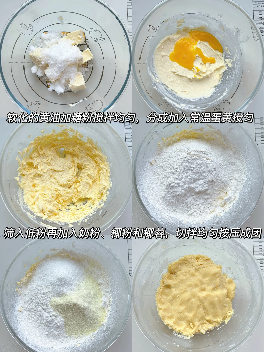 ✅低筋面粉110g,黄油80g,糖粉20,室温蛋黄2个(约40g),奶粉25g,椰浆粉20g,椰蓉20g,刷面蛋黄一个
