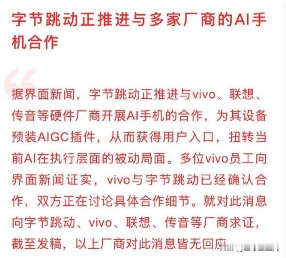 据界面新闻,字节跳动正推进与vivo、联想、传音等硬件厂商开展AI手机的合作,为其设备预装AIGC插件,从而获得用户入口