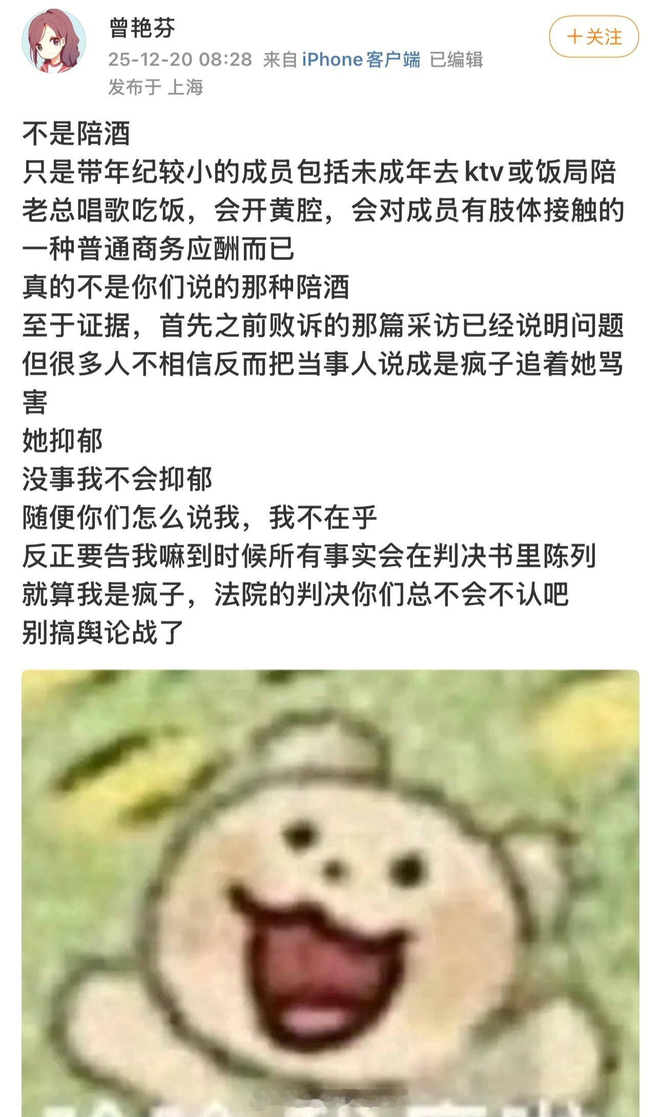 曾艳芬再次发微博,说丝芭带成员去陪酒,是指带年纪较小的成员(包括未成年)去ktv或饭局陪老总唱歌吃饭,会开黄腔,会对成员有肢体接触。