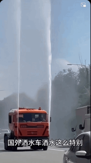 朝天洒水, 这是在干什么? 平生第一次见, 洒水车朝天洒水! 这是什么原理, 难道是要找下雨的感觉? 瞅一眼评论, 也没找到相关的说明! 谁知道这是为什么!