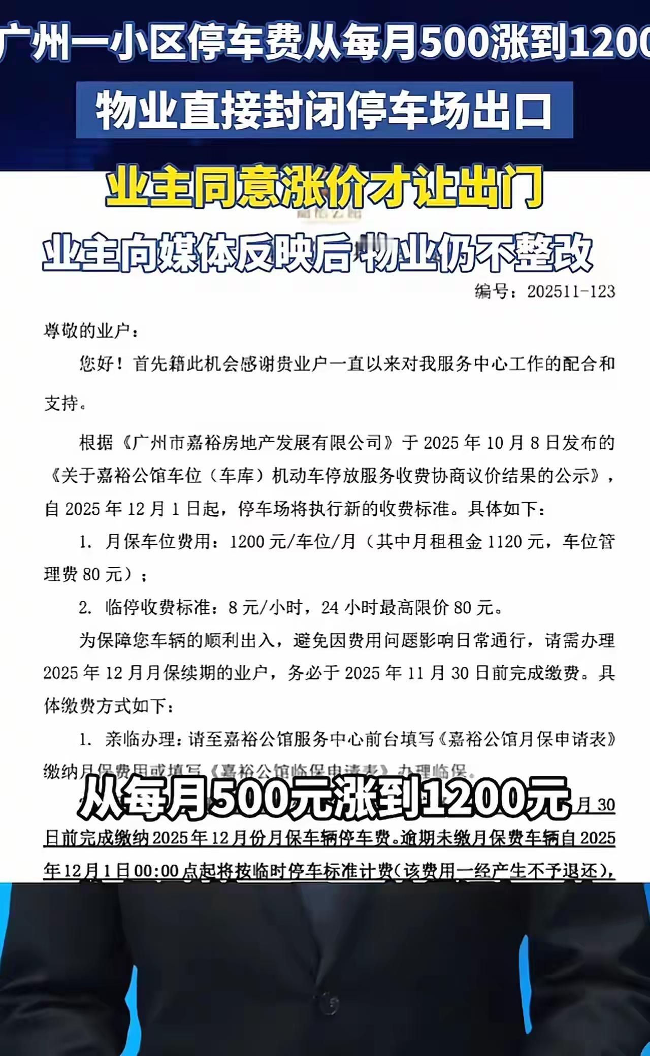 法治社会竟如此嚣张?广州一小区,物业单方面宣布停车费从每月500元涨至1200元。为逼迫业主交钱,物业直接封闭停车场出口,业主同意涨价才放行!业主抱怨:“这跟恶霸没两样,好多人因为没交钱,上班上学都迟到了!” 在法治社会里,物业管理需遵循法律法规,依法依规收费与管理,绝不能采用威胁、封堵等不正当手段强制业主缴费。你提及的广州某小区物业单方面涨价,还封闭停车场出口逼迫业主接受,显然已逾越合理管理的界限,涉嫌侵犯业主合法权益,甚至可能触碰法律底线。 物业收费应依法依规:物业服务收费需依据《物业管理条例》等法律法规,经业主大会或业主委员会同意,做到合理透明,不可随意涨价或胁迫业主。 封堵出口属违法行为:封闭停车场出口,限制业主正常出入,可能构成非法限制人身自由或妨碍交通,严重违反相关法律法规。 业主有权依法反对不合理涨价,可通过合法途径维权,如向物业管理部门投诉、申请调解,甚至诉诸法律。 物业公司作为管理者,应秉持诚信、公平原则,合理处理收费问题。以威胁、封堵手段逼迫业主接受涨价,既不道德,还会引发更大矛盾与不安。 应对建议: 业主可组织起来,联合反映问题,向物业公司表达诉求。 向业主委员会或物业管理部门投诉,要求依法处理。 必要时,寻求法律援助,通过法律途径维护权益。 政府相关部门应加强监管,依法查处违法违规行为,维护社会秩序和业主权益。 在法治社会,任何单位或个人都要遵守法律法规,不能以威胁、胁迫或非法手段行事。业主合法权益应受尊重与保护,物业公司应依法合理收费、管理。公众监督与法律威慑力,是维护公平正义的重要保障。