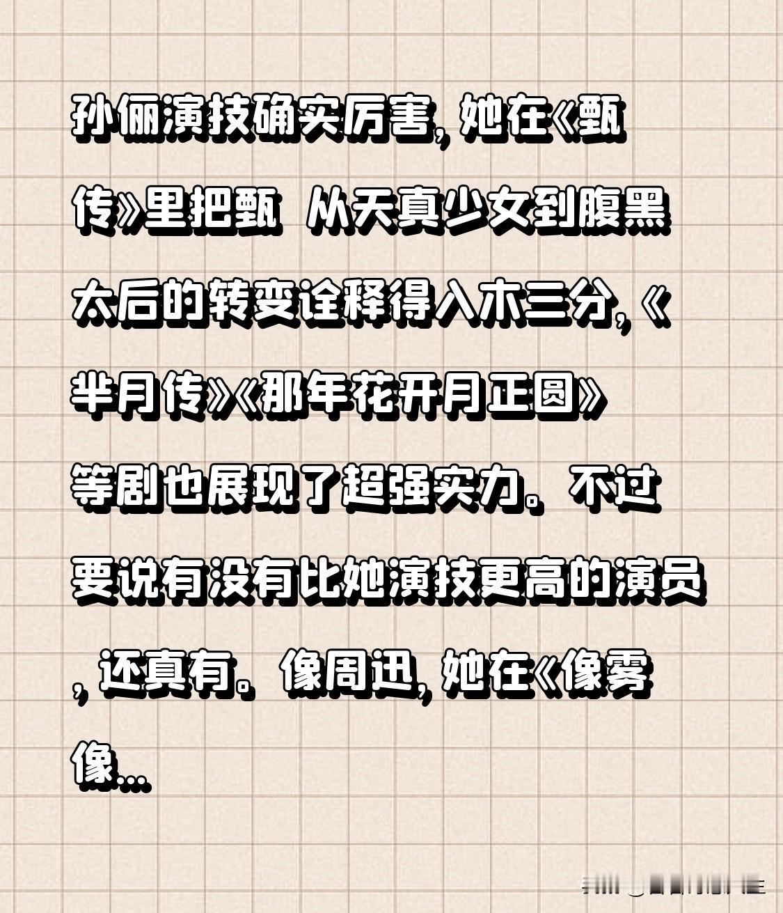 孙俪演技确实厉害,她在《甄嬛传》里把甄嬛从天真少女到腹黑太后的转变诠释得入木三分,《芈月传》《那年花开月正圆》等剧也展现了超强实力。不过要说有没有比她演技更高的演员,还真有。 像周迅,她在《像雾像雨又像风》里灵动俏皮,《李米的猜想》中把李米的执着与疯狂演绎得淋漓尽致,那种细腻的情感表达让人感同身受。还有陈宝国,他在《大宅门》《汉武大帝》等剧中,将角色的霸气、威严等特质刻画得入木三分。所以,演艺圈卧虎藏龙,比孙俪演技高的演员或许存在。 孙俪 孙俪邓超演技 邓超 孙俪 明星 [送自己一朵花][送自己一朵花][送自己一朵花]
