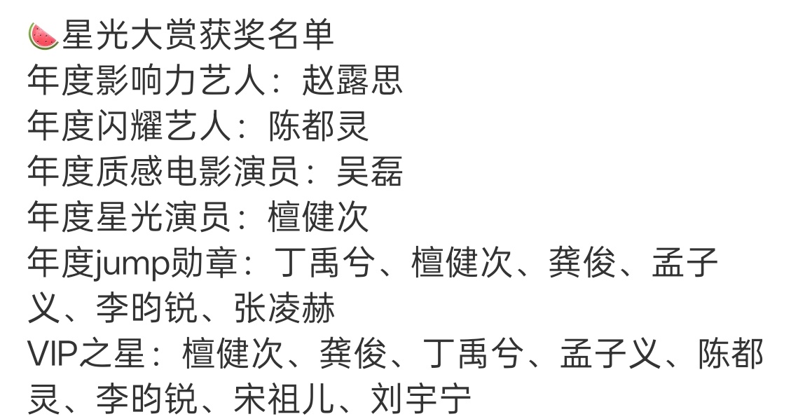 星光大赏网传获奖名单年度影响力艺人:赵露思年度闪耀艺人:陈都灵年度质感电影演员:吴磊年度星光演员:檀健次年度jump勋章:丁禹兮、檀健次、龚俊、孟子义、李昀锐、张凌赫 VIP之星:檀健次、龚俊、丁禹兮、孟子义、陈都灵、李昀锐、宋祖儿、刘宇宁 星光大赏网传获奖名单 星光大赏