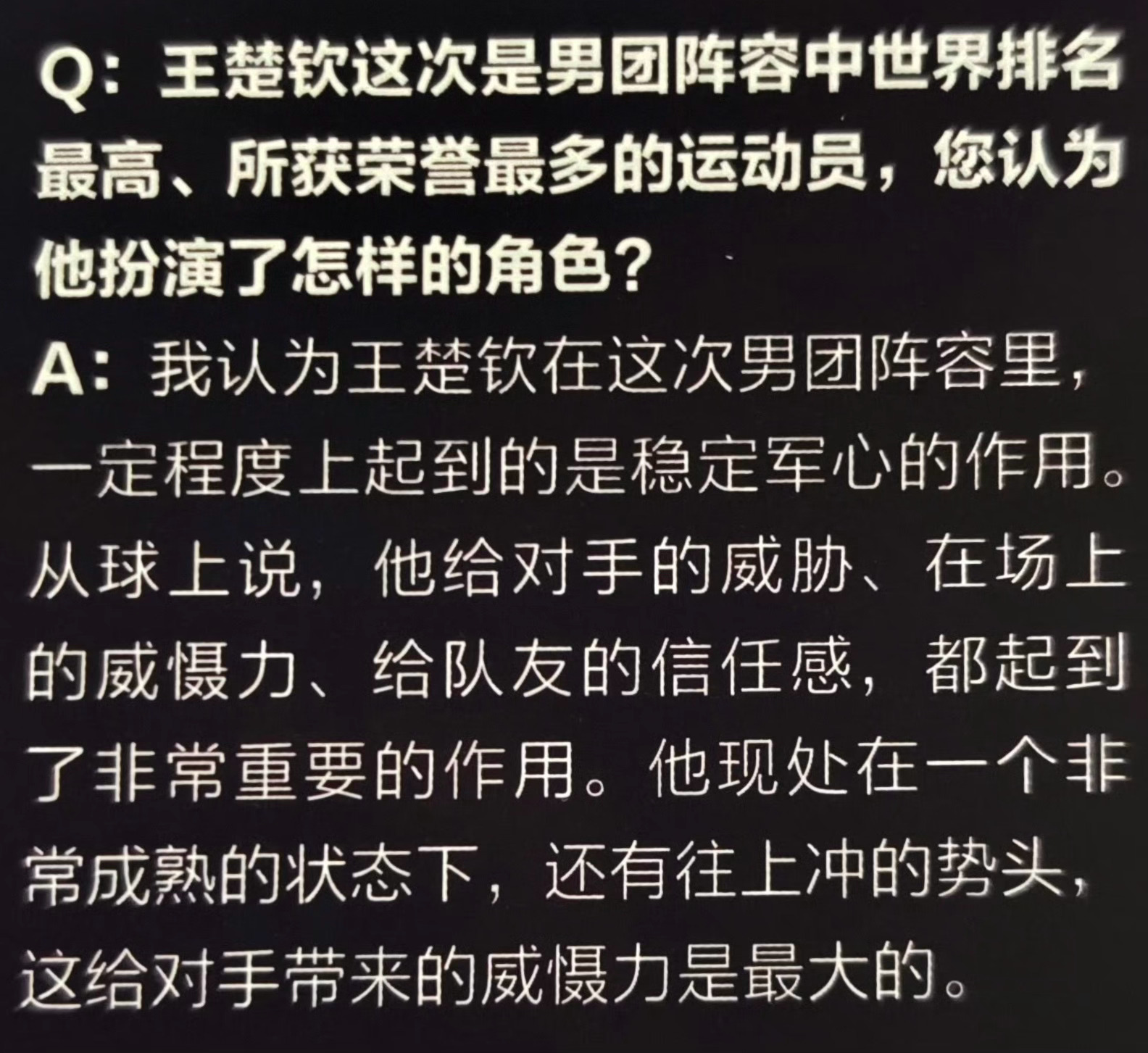 巴黎之后你们男队如果没有王楚钦就是百分百完蛋的 所有的兜底和稳定军心都是他 不懂有什么资格去指责这样一个在艰难时刻为了团队尽心尽力的人