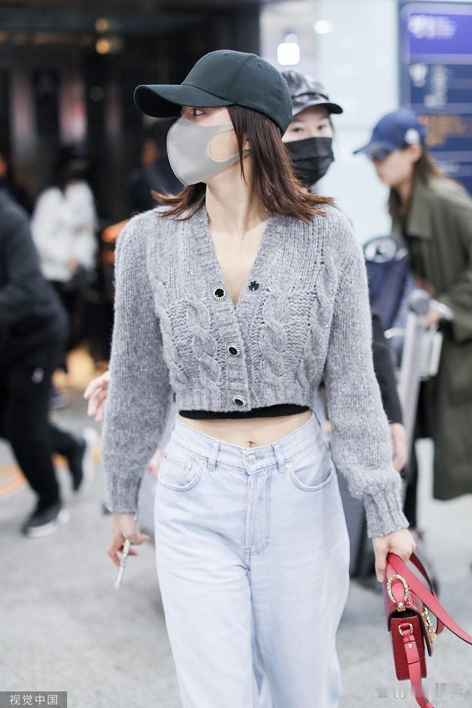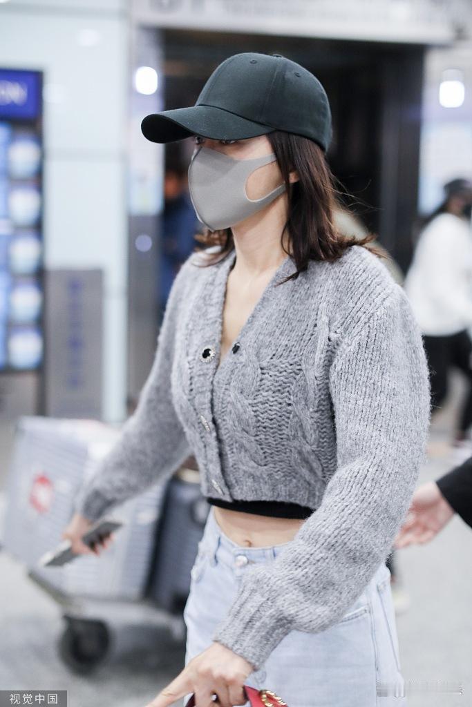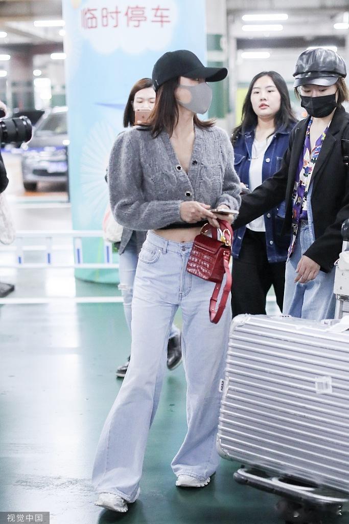 秦岚穿露脐毛衣秀蛮腰 身材比例优越机场大步疾走又美又飒