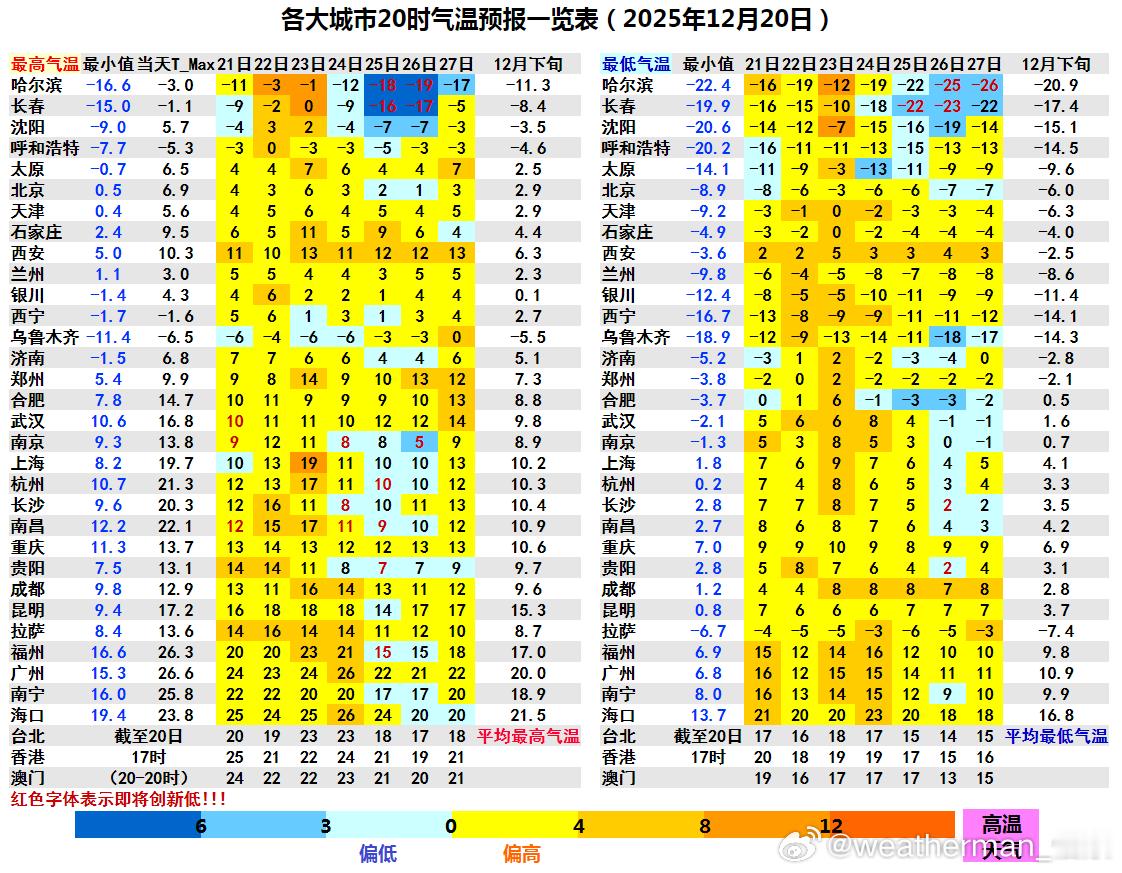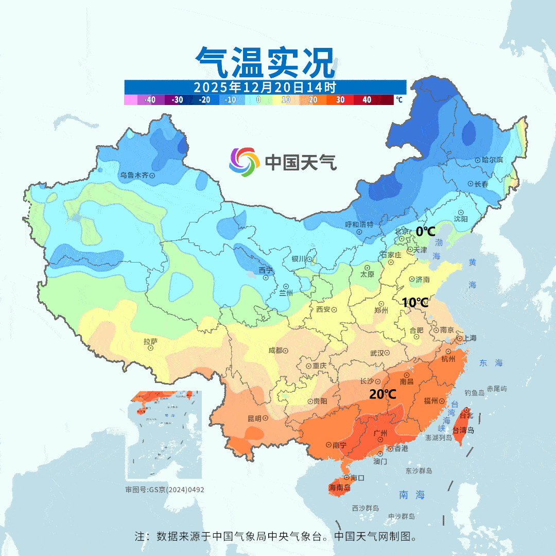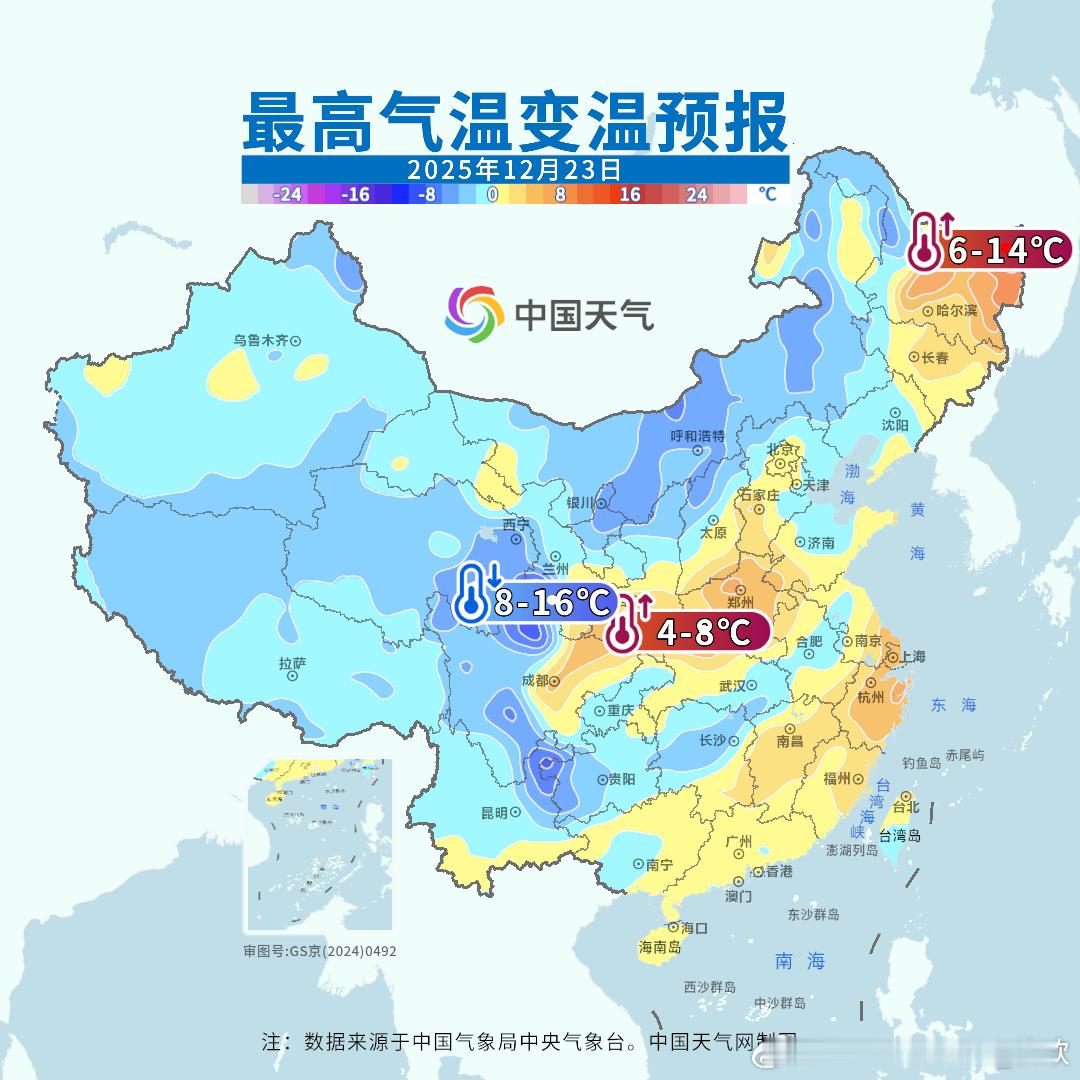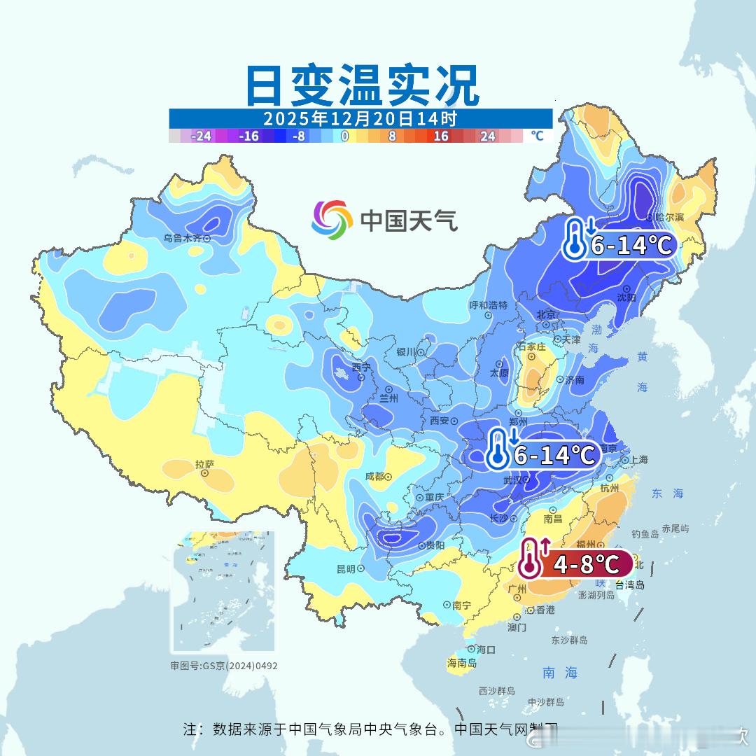 【气温快节奏变化】今天因为冷空气影响,东北到长江中下游多地出现6-12℃降温,不过在连片的降温区中,太行山东侧的河北南部和河南北部,逆势升温。因为西北风下沉增温+驱散雾霾后光照加热,抵消了降温。明天冷空气继续东移南下,东北北部和东部、江南多地还有6-12℃降温,近期偏高的气温打回正常水平附近。不过冷空气一走,气温就回升,明天在青海甘肃宁夏内蒙古中西部,就会有明显升温,后天东北到江南气温也会反弹。但新一股冷空气22-24日还会导致我国多地自西北向东南出现降温。东北和江南一带,是气温变化最明显的区域。长春今天最高零下1℃,明天零下9℃,23日0℃,25日零下16℃。上海今天最高20℃,明天10℃,23日19℃,25日10℃。