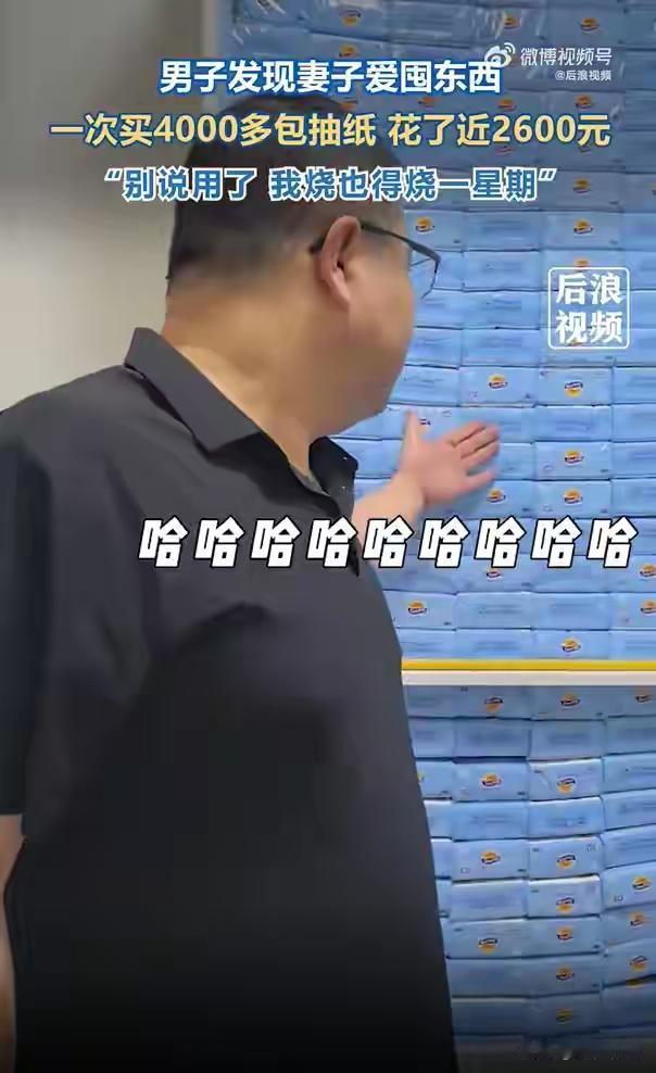 你身边有喜欢囤货的人吗?我们来看看这家老婆,花2593元,一次性囤了4000多包卫生纸,囤满一面墙,不用切墙了。 她老公说:用了两年了,感觉动都没动。 发这个视频的是这家男主人。 他家是陕西西安的,妻子喜欢囤货。 网络购物 更是让妻子收不了手,看见便宜的卫生纸,喜欢的卫生纸,就喜欢买买买。 这越买越多,越买越上瘾。 在这家男主人的视频中,他晒妻子爱囤卫生纸的时候,我都笑了。 这一打开柜门,码的整整齐齐一面墙,全是卫生纸。 这些卫生纸都是一个牌子的,都是一种颜色,蓝色的外包装。 这堵墙,很美。 老公戏称:“就是烧也要烧一个星期”。 是啊,4000多包,不是小数目。 老公还说,卫生纸都用了两年了,还是感觉动都没动。 我们给他们家算一算,一包卫生纸,怎么也得用四五天吧。 一个月咱给他算6包,一个月18包,一年200包。 这4000包和200包,当然看不出来少。 老公翻出两年前的订单显示:2023年一次买了4000多包卫生纸,总计2593元。 这都囤两年了,很替他们担心,这卫生纸会不会过期呀? 这4000多包卫生纸,得用多少年呀? 给他们家一个建议,既然老婆喜欢囤货,这老公可以卖出去呀! 这不就解决大问题了嘛! 其实,喜欢囤货的人很多。 比如我外甥女,家里囤的袜子,好几个抽屉,都是她的袜子。 厚的 ,薄的,长的,短的,黑的,白的,花的……。 家里新的袜子,旧的袜子,半新半旧的袜子……。 前几天,给我捎来40双,20双全新的,20双穿了一次两次的。 看那一大袋子袜子,我都笑了。 我得穿多少年呀? 外甥女说:小姨,等这些袜子穿坏了 你不要买,我家里很多,再给你送。 这喜欢囤货的人多了去了。 不过,我不喜欢囤货,怕过期。 更主要的是手里没钱,囤多了没有地方放。 朋友,你喜欢囤货吗?