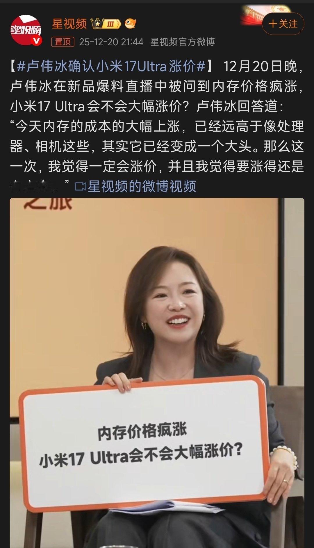 卢伟冰确认小米17ultra不仅会涨价,而且还会涨得比较多! 卢伟冰对此的解释是,因为内存的价格涨得比较多。不过小米的宣传大家都知道,有时候说不定在最终环节会给大家一个惊喜。 现在还真的有点期待小米17ultra究竟会带来怎样的花样?是不是双折叠?还是在小屏方面有更多的效果。 大家是怎么看的?欢迎评论区留言。