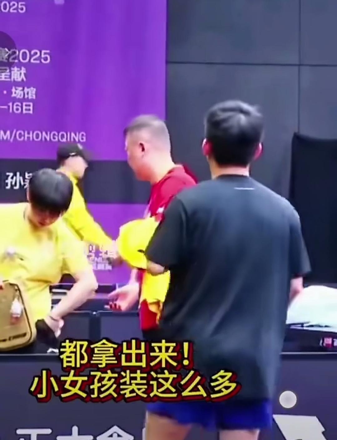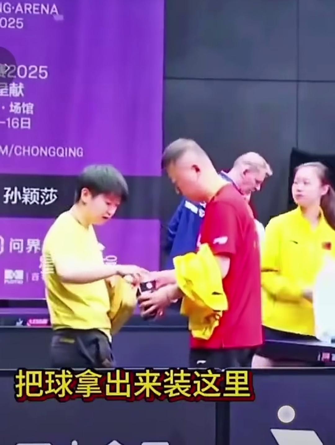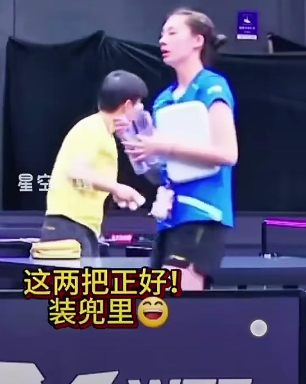 看莎莎捡球,感觉她就是个小宝箱。太能装了! 训练完,都要把球再返回原地,莎莎想一次性拿完,不想来回跑,没想到莎莎手那么小,技术那么好。 只见莎莎一手拿五个球,两个口袋都装满。 这边马琳拿着球桶过来装球,只见莎莎把一个口袋里的球一股脑装进球筒里。马琳示意还差呢? 莎莎赶紧伸手掏另一个口袋,马琳当场就惊讶了,寻思,这孩子还挺能装。 看看旁边的外国选手也是一脸惊讶。 要不说莎莎真能装呀! 多一趟都不愿意跑!