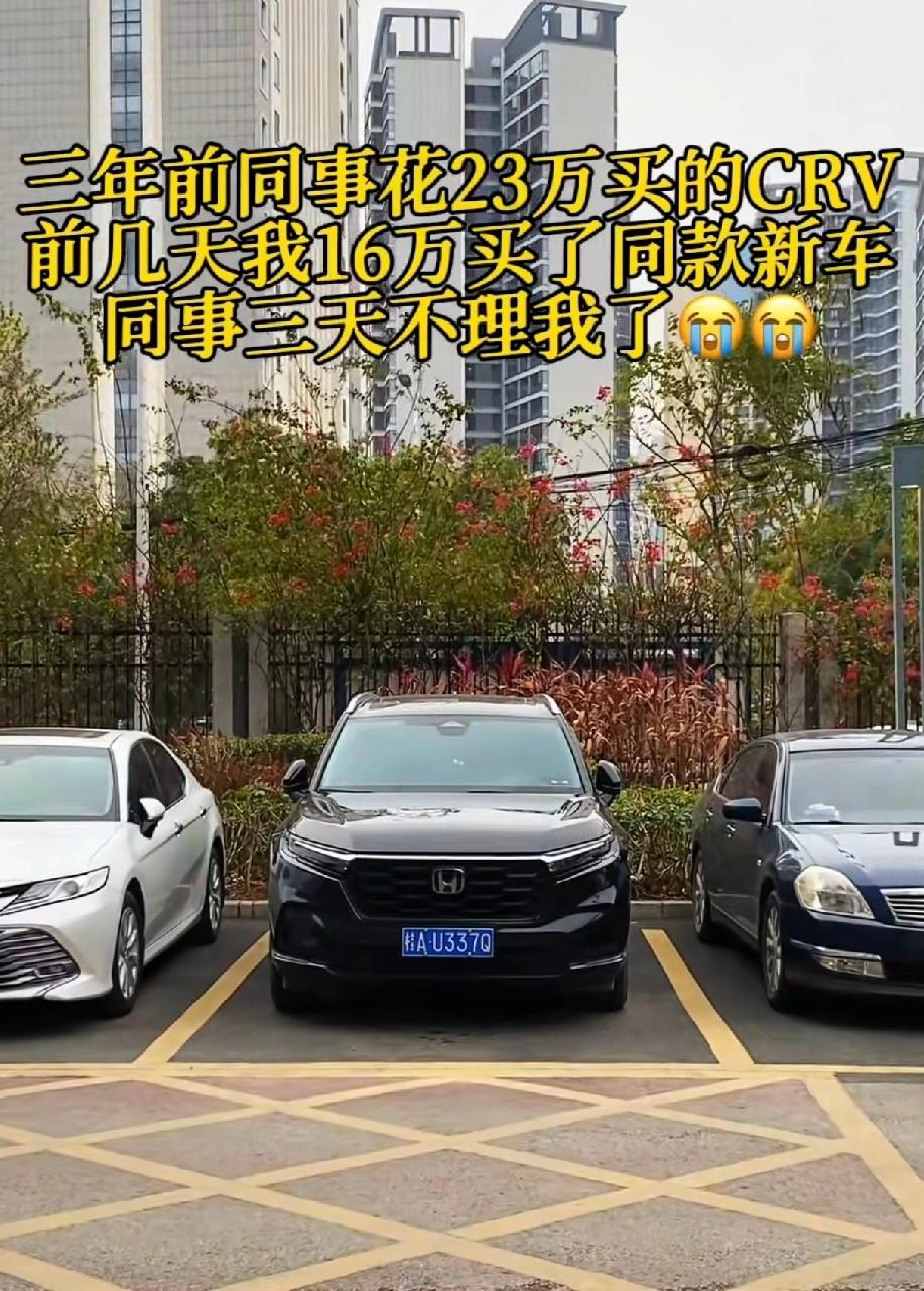 2023年8月份我花了20.4万买了crv睿型版,然后10月份在车友群里面就看到有人花19万就买得到同样的版本。 2024年不但18万多就买得到同样的版本,而且还送5年质保,还送积分。 没办法,新能源汽车打价格战打的太狠了,传统的合资油车根本接不住,这也是为什么crv的销量越来越下降的一个本质原因。 其实虽然我自己感觉自己是冤大头,买贵了,但是从长远上来说还是好事的,毕竟以后换车的成本越来越低了。车辆从以前的奢侈品变成了真正的代步工具,现在大部分家庭都不止一辆车,以前买一辆车全程打爆竹庆祝,现在的话,买车就跟买手机差不多,这也是大家生活水平显著提高的标志。 等哪天我们中国像美国一样,孩子毕业的礼物可以送一辆汽车的时候,那才是真正步入发达国家的标志,相信这一天很快就会到来。 你是花多少钱买的本田crv呢?买贵还是买便宜了?大家可以在评论区发表一下,大家分享分享。东风本田CRV 本田cr-v 本田混动crv 本田-cr-v 新crv 上热门crv 车crv