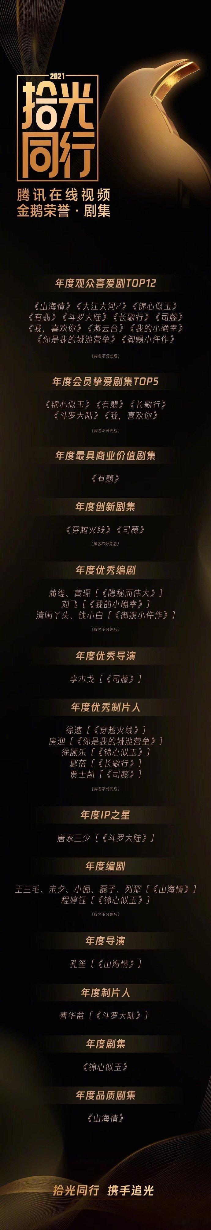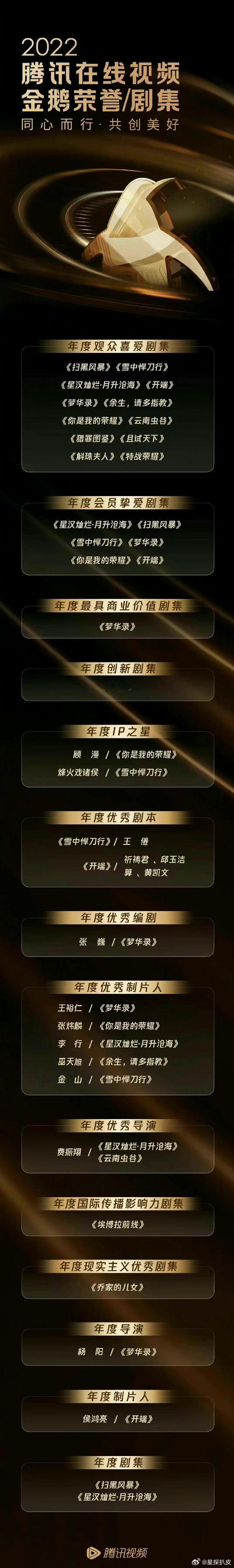 腾讯年度剧集腾讯近五年年度剧集 2025《许我耀眼》2024《庆余年 第二季》2023《长相思 第一季》2022《扫黑风暴》《星汉灿烂·月升沧海》2021《锦心似玉》