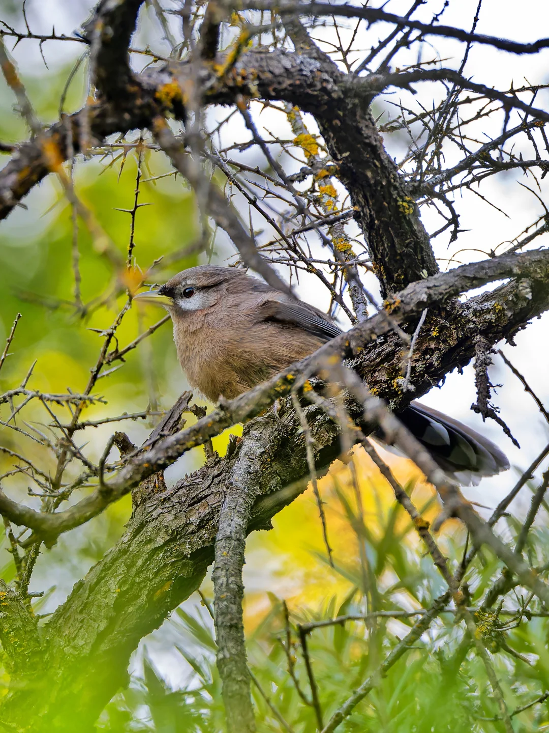在甘肃莲花山,一大早就有小群黑额山噪鹛在大声鸣叫,但是总是隐藏在浓密的灌木丛里,而且跳动快速,鲜有露头,对焦都困难,差点放弃。最后还是抓住了一次机会,穿过茂密的灌木枝条拍到一张。
