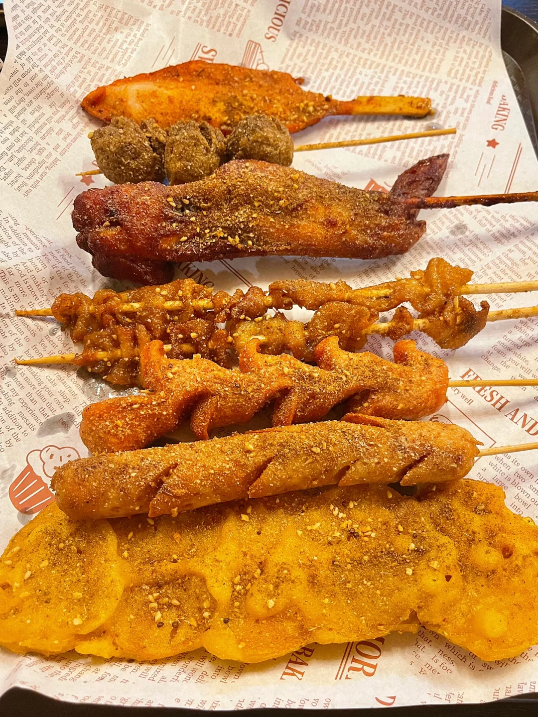🍡炸串:点了自己爱的炸串,有鸡翅、鸡柳、热狗肠、鸡肉肠和鸡翅,味道都不错,适合当宵夜吃,下次点烤串会加点辣味道会更足~