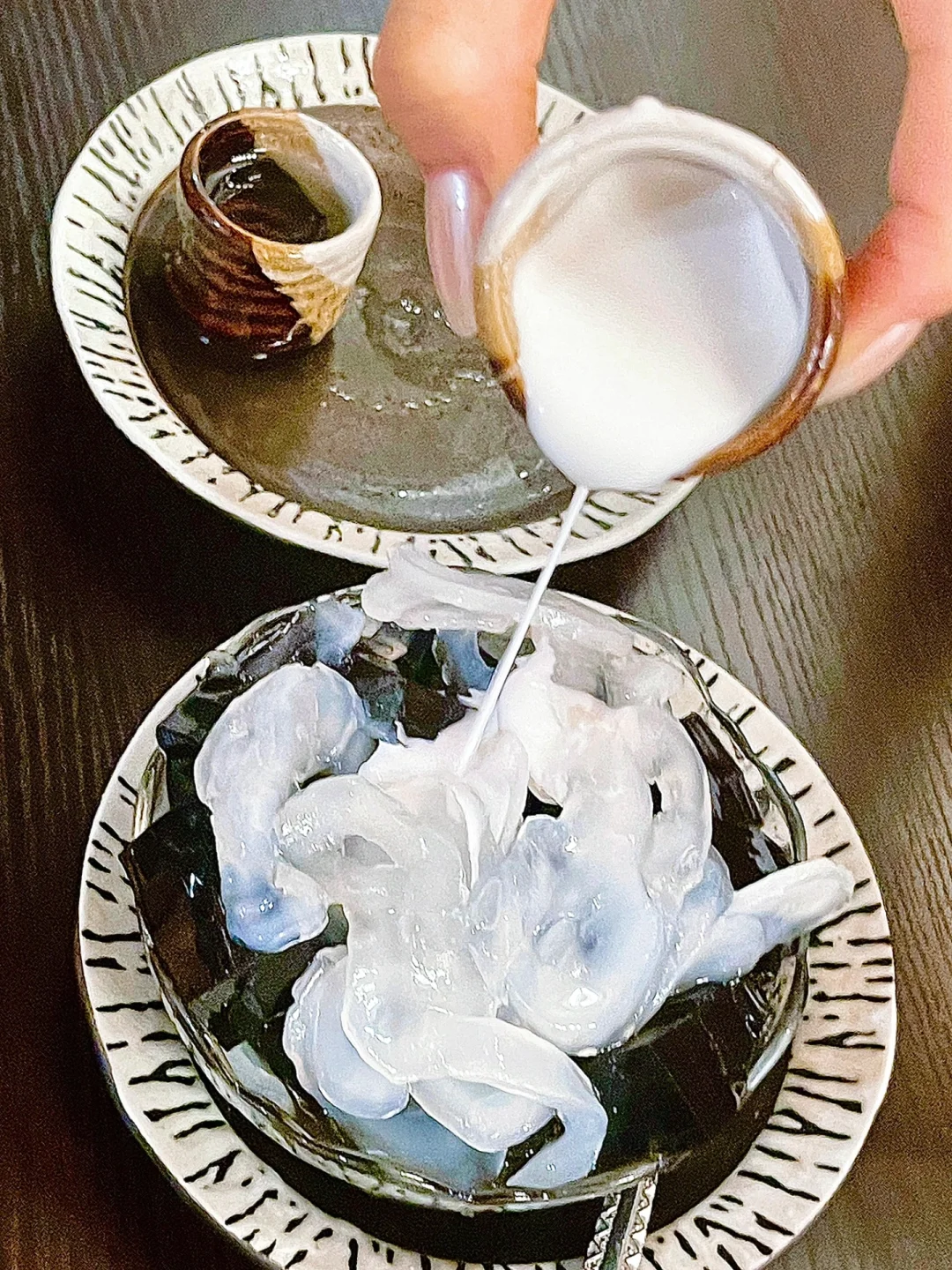 🥥海底椰凉粉:标配一小杯蜂蜜和炼奶,可以控制这碗凉粉的甜度,我还是比较爱吃甜的,全部倒入搅拌后觉得刚刚好,凉粉冰冰凉凉甜甜,味道不错。