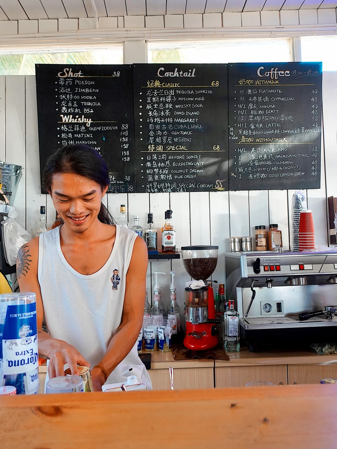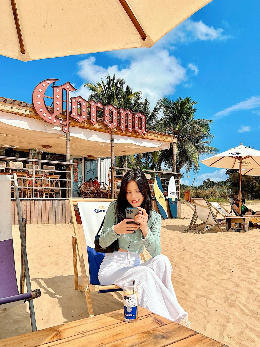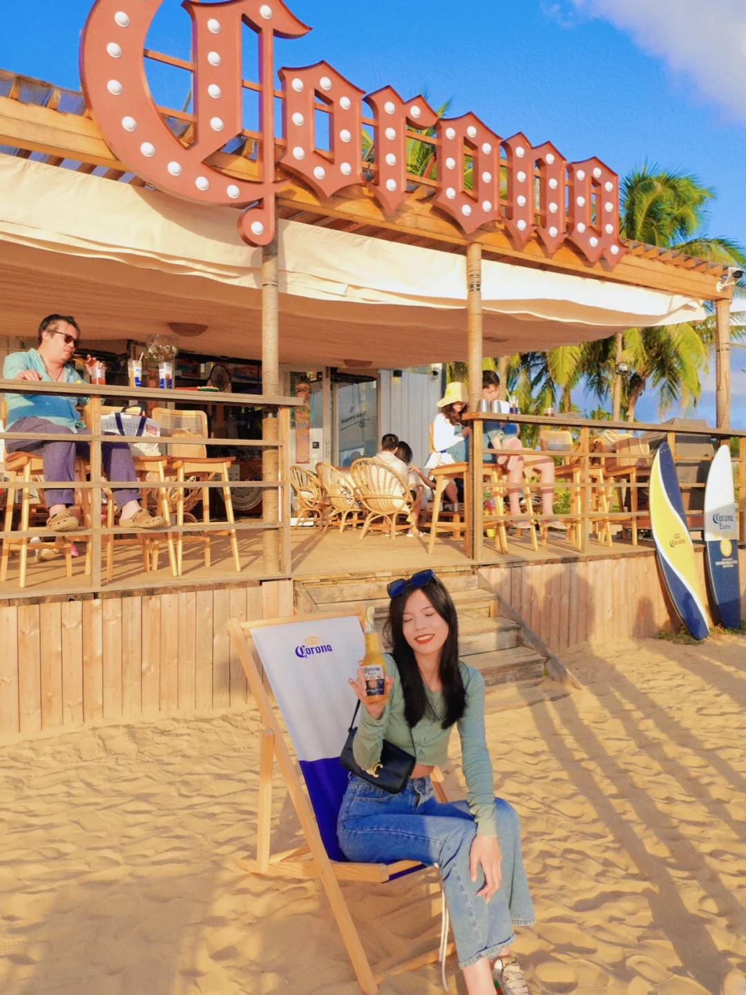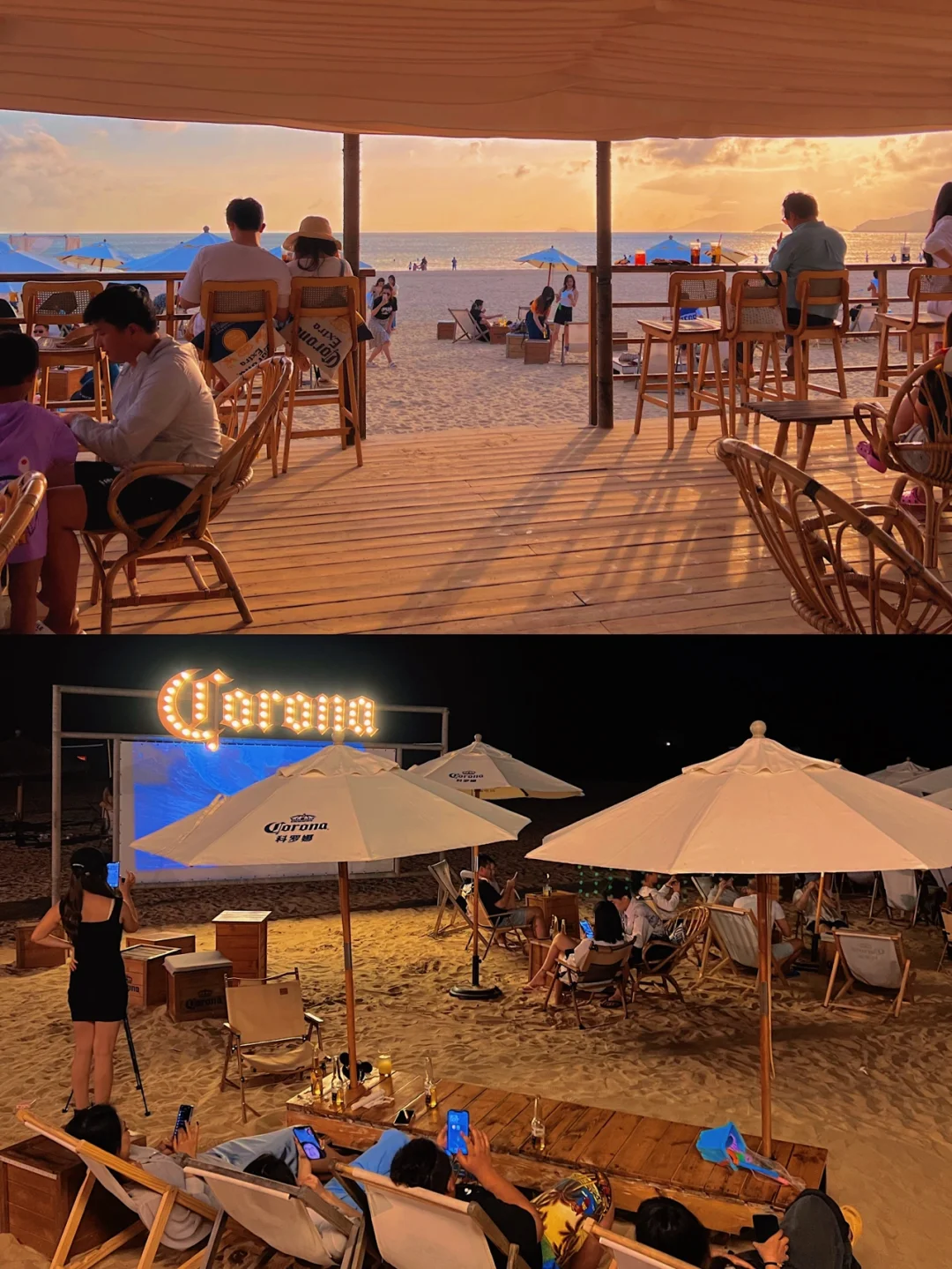 ✨三刷:晚上十点多来海边散步,散完步过来喝东西聊天,来酒吧的人不多也不少,这个时候可以拍一下科罗娜酒吧夜景的氛围感,除非自己有带灯补光,不然不太适合人像拍照哦。