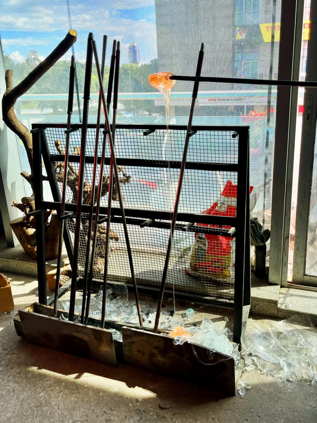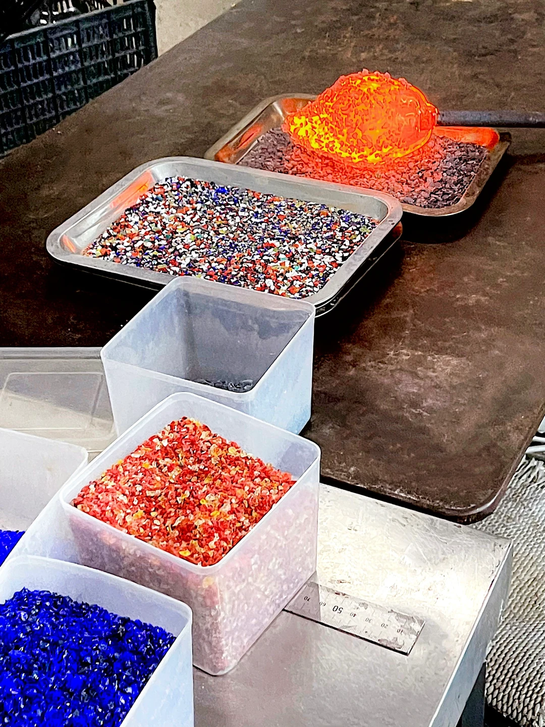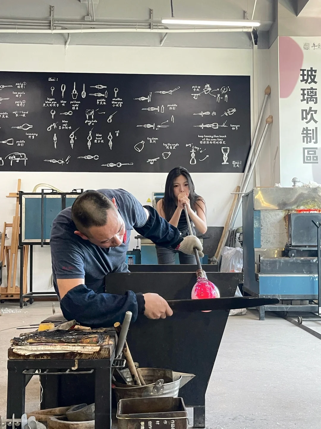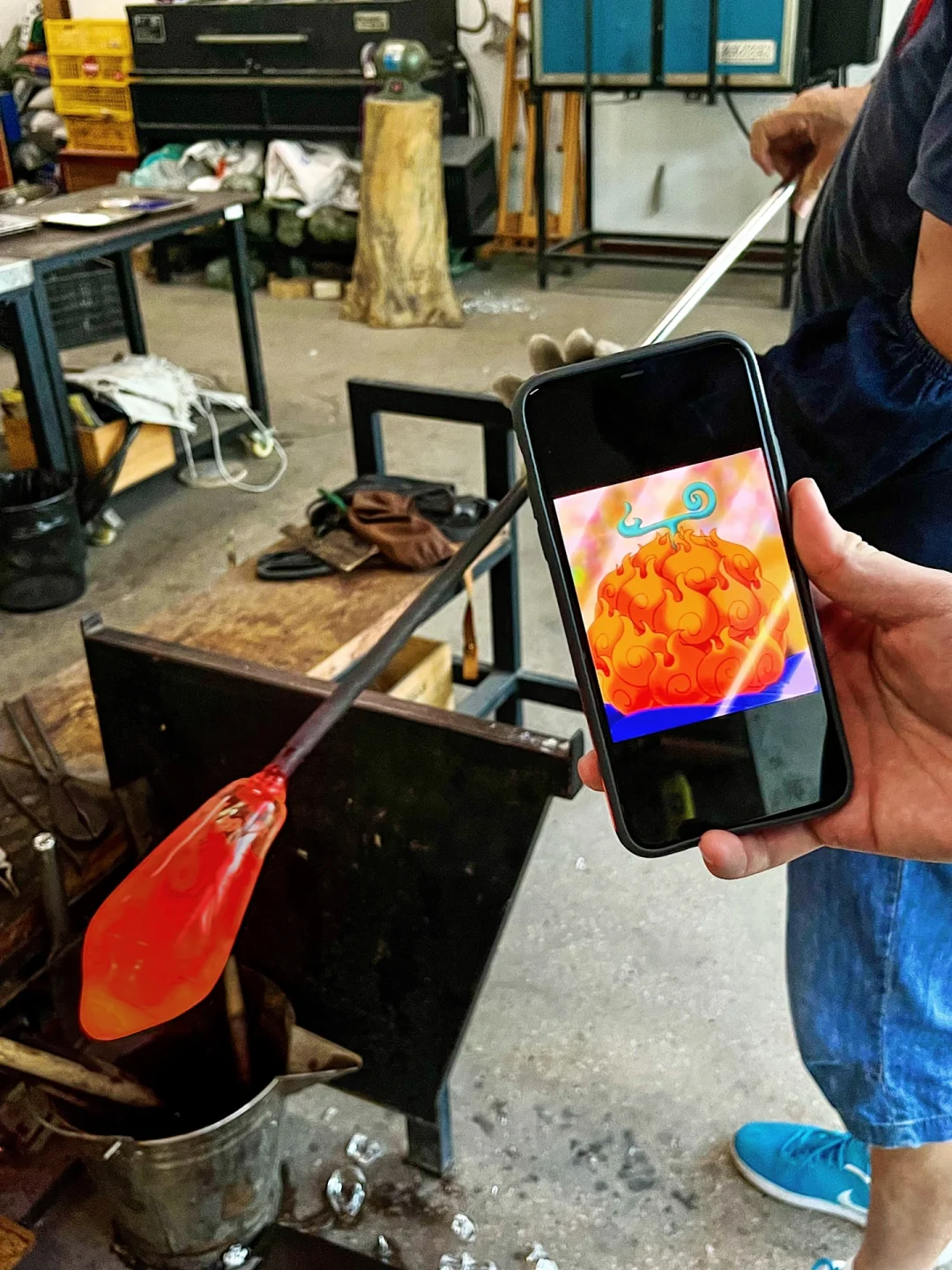 💙师傅会拿着吹完气的玻璃,沾上我们自选的玻璃颗粒颜色,玻璃的瓶面很艺术地沾上不同的颜色,接着继续放到高温炉口转动❤️🔥转完拿出来的半成品玻璃真的太漂亮了!是热烈朝阳红🤩太像海贼王里艾斯的烧烧果实,我吹出了艾斯的烧烧果实(我吹牛的哈哈)海迷吹疯了~