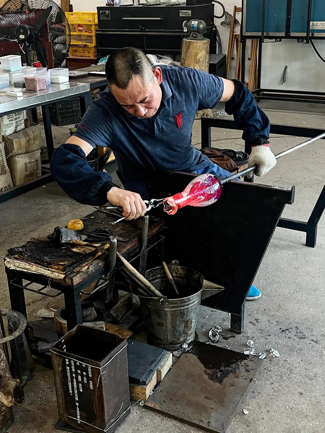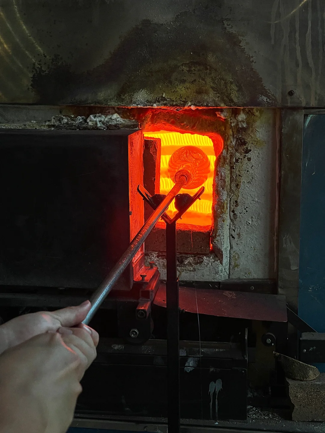 🔔师傅会拿着液体玻璃在高温炉口烤出玻璃的基本的形状,再接入一个小吹管给我们🔎吹玻璃开始要柔和的吹,不用花太大的力气去吹,一边吹一边转动杠子上的玻璃。