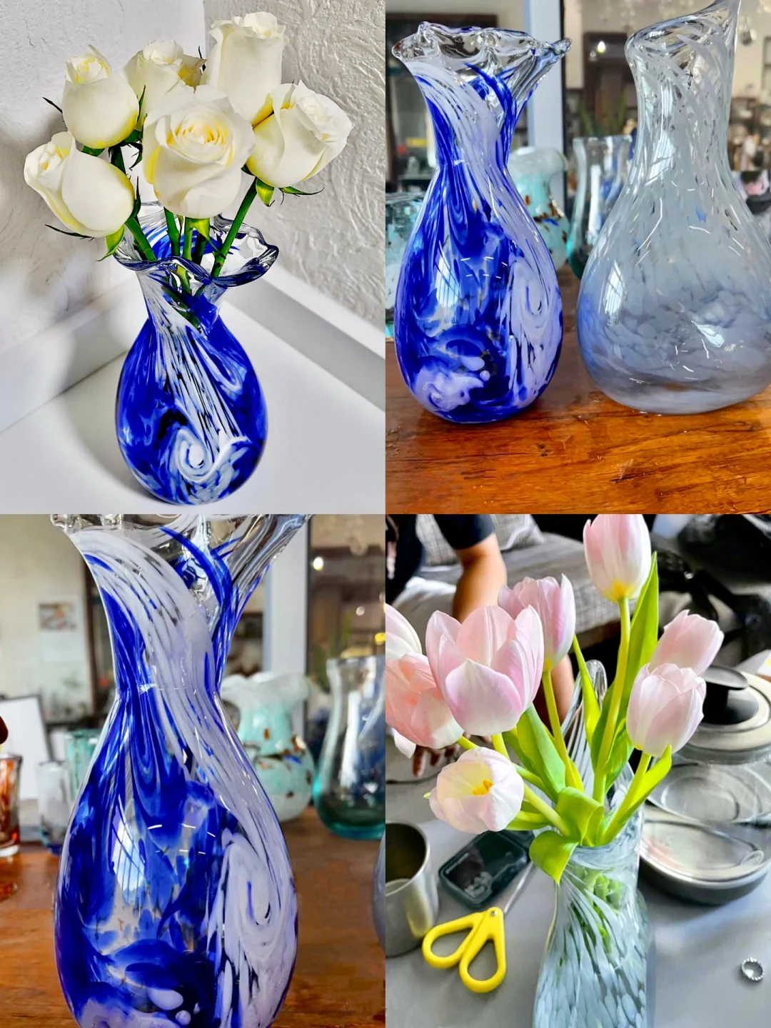 😎整个吹玻璃的过程,师傅就会用手艺去拿打磨好玻璃的形状,只要不断配合师傅的节奏去吹玻璃就行,最后完成的玻璃会放进低温冷冻箱里面冷却成型,要等到第二天才拿玻璃✔️因为我家里离观澜比较远,就选择快递到家里,快递到家要自己承担额外的快递费🔛拿到玻璃成品的我非常喜欢了🔵瓶身蓝白相间不规则的排列衔接很有层次感,我去买了白玫瑰放在这个玻璃上太漂亮了.