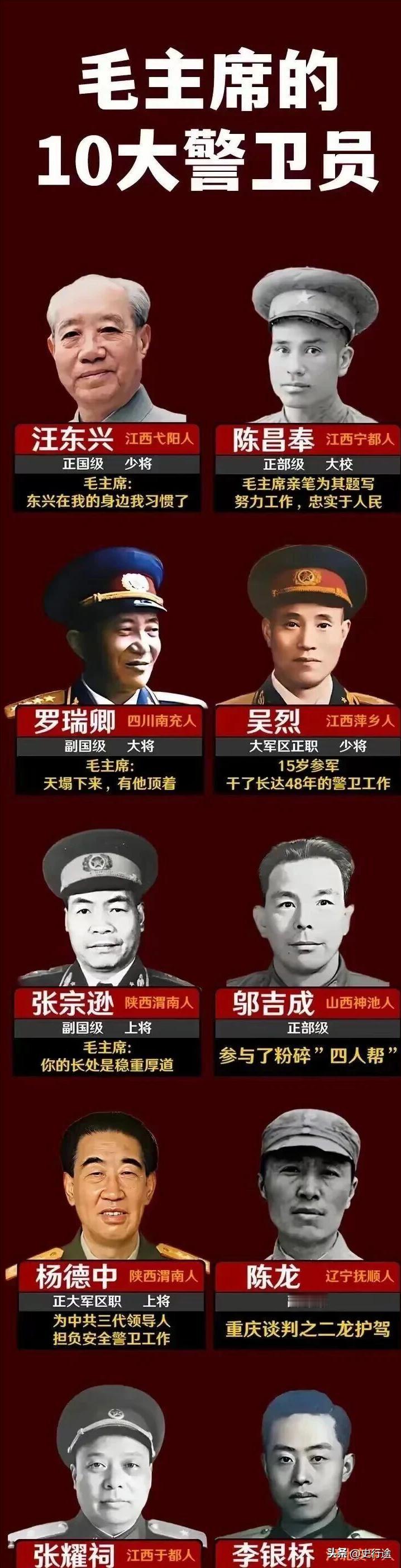 毛主席的十大警卫员 1.汪东兴——江西弋阳人,正国级 少将 享年100岁 2.罗瑞卿——四川南充人,副国级 大将 享年72岁 3.李银桥——河北安平人,副处级 享年82岁 4.张宗逊——陕西渭南人,副国级 上将 享年91岁 5.杨德中——陕西西安人,上将军衔 享年97岁 6.吴 烈——江西萍乡人,少将军衔 享年86岁 7.邬吉成——山西神池人,正部级别 享年79岁 8.陈昌丰——江西宁都人,正部级,大校 9.张耀祠——江西于都人,正部级,少将 享年95岁 10.陈 龙——辽宁抚顺人,副部级 终年48岁 这十个人,很少同时站在一张照片里,却共同站在同一个位置上——毛主席身边。 有人一辈子沉默寡言,只负责把危险挡在几步之外;有人后来走到国家权力结构的高处,却始终保留着警卫员的站姿与警觉。他们的军衔、级别、寿数各不相同,出身南北有别,结局也不一样,但有一点高度一致:在最关键的年代,被毛主席放心地交付过身家性命。 正是在这样一组名字中,罗瑞卿的位置,既熟悉,又格外特殊。 毛主席那句“罗长子往身边一站,天塌下来有他顶着”,听着像玩笑,其实像一句军令,当事人都心里有数。 1906年,他出生在四川南充双女石村,家里穷得很普通。 二十多岁闯进乱世,1926年进黄埔军校武汉分校,先入共青团,1928年转为中共党员,随后干起秘密工作。 1929年参加红军,从支队党代表干到红一军团保卫局局长。 闽西代表大会上,会场里里外外都让他盯着;长征路上,毛主席、周恩来走到哪,他的警戒圈就画到哪。 雪山草地上队伍损失不小,中央领导却一个没少地进了陕北,很多老红军提起保卫工作,嘴里离不开“罗长子”三个字。西安事变前后,中共代表出入西安,他照例在暗处守着,在枪口与照相机的缝隙里给领导人留出了安全通道,这些细账,毛主席和周恩来心里都一清二楚。 解放战争打到后半程,他已经是华北军区政治部主任兼第十九兵团政委。 太原解放后,部队并入第一野战军,他按原计划要随军西征。 1949年5月中旬,毛主席从北平发来电报,请他“赴京一叙”。香山双清别墅的房间并不大,说的事却关乎新国家的“门神”:中央军委准备成立公安部,毛主席点名让他当部长。 罗瑞卿心里还有点拧巴,真心想跟着部队打到西北、西南,看红旗插满大江南北,还认真推荐了长期做情报的李克农,自认那才是内行。 毛主席听说后问:“新国家要立家业,都说去打仗,都不管公安,这家谁来守?”话说到这一步,他只好把话放死:“党让干,就当一辈子人民警察,不会可以学。”这一句,既是表态,也是自个儿给自个儿下的军令状。 1949年7月6日,中央军委公安部在北平挂牌,地点选在天安门东南那片旧英兵营。 罗瑞卿一到任,先搭班子,粗粗划出几块:有管政治保卫的,有盯经济安全的,有抓治安、边防、武装、人事的,再配一个办公厅、干部学校和直属部队。 干部紧缺,他给毛主席写报告,要部队源源不断输送中下级骨干,又去找周恩来、聂荣臻,争取华北军政大学成批调来知识青年。一段时间里,一拨拨穿旧军装的年轻人背着铺盖卷进院子,新中国公安队伍的底子就是这样垫出来的。 1949年10月19日,中央军委公安部改名为中央人民政府公安部,1954年9月又改叫中华人民共和国公安部,他从头干到1959年,整整十年。保护中央,他组建警卫局、中央警卫团,中南海和党中央机关的安全压在这支队伍肩上,讲的规矩很简单:屋里要紧,外面别摆臭架子,让首长既安全又能见到老百姓的脸。 对内整治社会秩序,罗瑞卿的手同样不软。 北平刚解放不久,毛主席对他说,新中国不能再让娼妓遍地、黑道横行,要把这座城“好好打扫”。他当场接令,成立取缔妓院指挥部。 1949年11月21日晚8点,北京市出动2400多名干警,冲向五个城区和东西郊,次日凌晨5点,224家妓院全部关门。 第二天,《人民日报》刊登封闭决议和《解放妓女》的短评,各界拍手叫好。 上海等城市跟进,1951年他到“大世界”微服察看,当面骂那些老鸨、流氓恶霸是“吸血鬼”,1952年4月至9月,上海陆续取缔妓院,把“大世界”改成人民乐园。 北京四郊的“东霸天”“西霸天”“南霸天”“北霸天”,以及“四亭”“十二爷”等地头蛇,也在清理名单之列。北京、上海等十三个大城市,到1950年6月共抓获盗匪5477人,年底城市盗匪活动明显下去,“路不拾遗,夜不闭户”这句老话又回到街谈巷议里。 1954年,公安部正式改名为中华人民共和国公安部,1955年7月18日公安部队改称公安军,同年授衔,罗瑞卿被授予大将军衔。 1959年9月18日,他离开干了十年的公安战线。 后来命运几起几落,在七十年代中期恢复工作,1978年8月病逝。 很多老部下回忆他时,往往会先想起毛主席那句玩笑,再想起自家站岗时看到的身影:一个高个子往前一站,心就踏实了,这样的人,当警卫员也当大将。