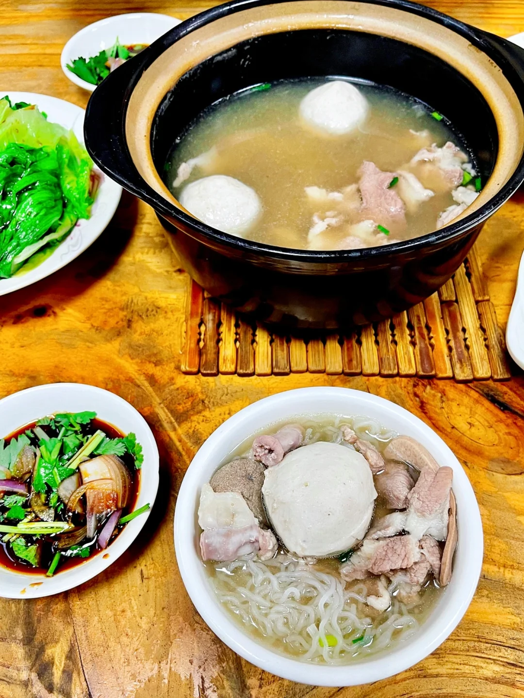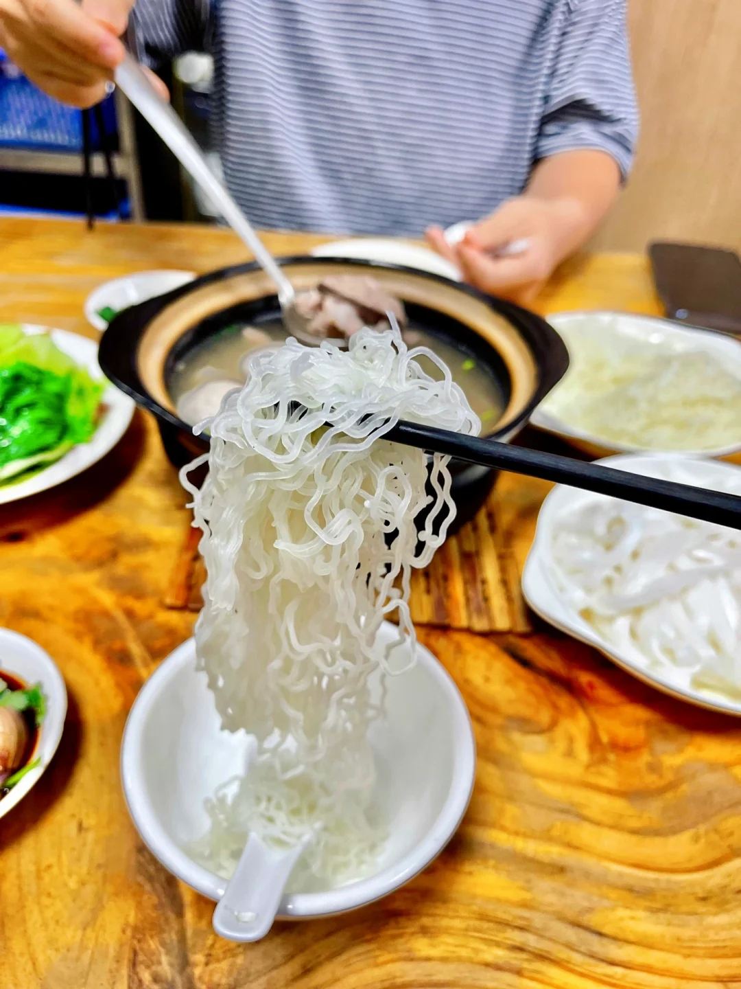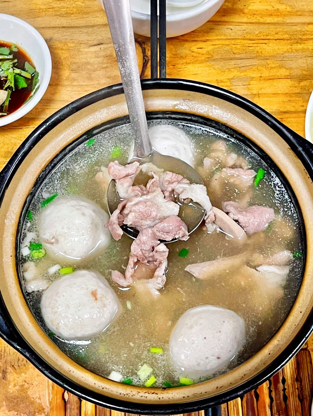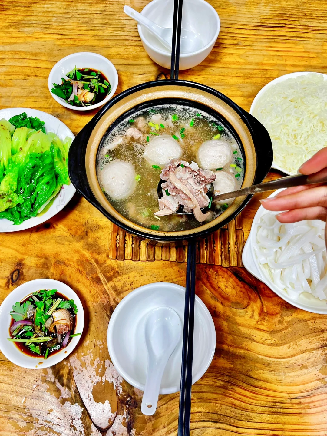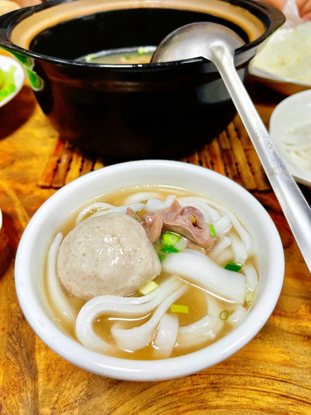❤️我和姐妹大概是下午一点多的时候过来吃饭的,人也不算太多,点了两位八刀汤,放在一个锅里一起一共40元,还加两颗大丸子,可以随意自选米粉或河粉都,再加一盘生菜美滋滋。我们都想试一下就把河粉和米粉都点了一遍~上桌就是一整锅八刀汤,里面放在很多猪杂,自己兑一碗汤再自助搭配河粉或米粉吃。