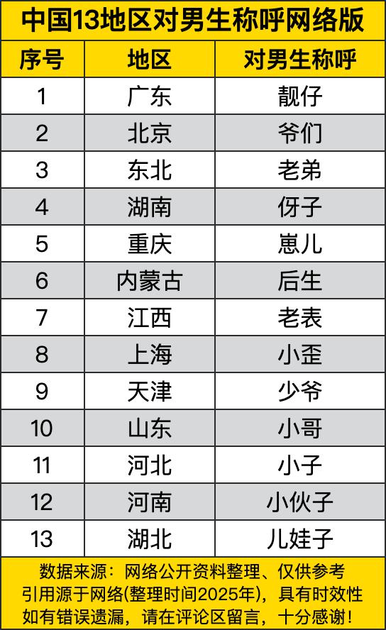 在广东,甭管长相如何,一句“靓仔”先喊得你心花怒放,堪称行走的“自信充值卡”。到了北京,画风一变,“爷们儿”一出口,带着股爽利和局气,仿佛下一秒就能跟你侃上半天大山。而东北的“老弟”,则把那种自来熟的热情体现得淋漓尽致,听着就让人觉得亲切。 再往南看,湖南人口中的“伢子”,重庆方言里的“患儿”,都透着点对年轻后辈的亲昵和调侃。江西人喊一声“老表”,听起来像在认亲戚,瞬间拉近了距离。上海的“小歪”则带着吴侬软语特有的细腻和些许俏皮,和这座城市的精致感莫名契合。天津的“少爷”称呼别具一格,既有几分老派的客气,又带点幽默的调侃,听着就像站在相声舞台边上。 有趣的是,这些称呼背后,往往藏着当地性格的密码。山东的“小哥”朴实爽快,河北的“小子”直接了当,河南的“小伙子”透着一股中原大地般的敞亮和实在。内蒙古的“后生”则充满了草原般开阔的生命力。湖北的“儿娃子”,在干脆利落中带着几分亲昵的责备感,很是生动。短短两三个字,不只是一个称呼,更像是一张张鲜活的地域文化名片。 总而言之,语言真是面有趣的镜子,照出各地不同的风土人情。从“靓仔”到“爷们”,从“小歪”到“后生”,每一种称呼都像一把钥匙,打开一扇了解当地性格与氛围的小窗。它们或许不够严谨,但足够鲜活;未必全面,却足够生动。下次如果你在旅途中听到这些特色称呼,不妨会心一笑——这可不只是几个字,这是一方水土在和你打招呼呢!