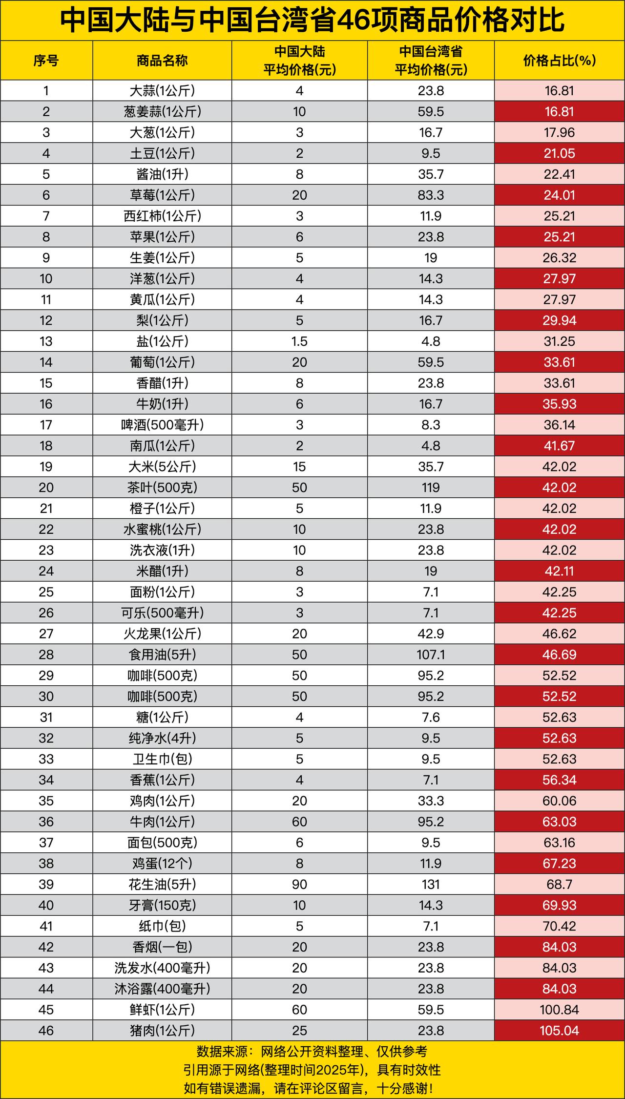 这份两岸生活用品价格对比表,简直像一场“物价跳水比赛”!从大蒜、大葱到土豆、酱油,咱们这边价格普遍只有对岸的零头。比如一公斤大蒜,这边4块钱能搞定,对岸要花将近24块,差价够在这边买好几斤了。葱姜蒜组合、大葱、土豆这些日常食材,对岸的价格标得让人直挠头,难道他们是连葱叶子都按精品包装卖的吗?看来,“菜篮子”的轻重,两岸同胞提起来手感还真不太一样。 不过,这价格差距可不是铁板一块。随着商品种类变化,两岸的价差就像坐滑梯一样慢慢缩小。从牛奶、啤酒到面粉、可乐,价格占比逐渐爬到40%-50%区间。等到鸡蛋、纸巾、牙膏这些日常消耗品,比例已经升到六七成。最有趣的是鲜虾和猪肉,表格里竟然显示咱们这边价格还略高一丁点。这趋势仿佛在说:基础农产品差价悬殊,但越是标准化、工业化的日常商品,两边的价格越倾向于“殊途同归”。 仔细观察还能发现一些有意思的细节。比如香烟、洗发水这类商品,两岸价格已经相当接近。这或许跟品牌、税费和流通成本有关。而茶叶、咖啡等饮品,对岸价格依然高出不少,可能跟消费习惯和进口依赖度不同有关。整张表看下来,像是一幅生动的民生经济剖面图,不仅反映了生产和运输成本的差异,也可能折射出两地市场结构、消费水平和生活节奏的不同。 总而言之,这份对比表虽然只是生活一瞥,却足以让人感慨“市场真是个神奇的调节器”。它既展示了大陆在基础生活物资保障和市场价格方面的显著优势,也体现了不同经济体制和发展阶段下,消费品价格形成的复杂逻辑。对于普通百姓而言,物价直接关系到每天的“小确幸”。这份清单或许能让我们更加珍惜当下便利实惠的市场环境,同时也对两岸民生经济的异同多了一份直观的了解。毕竟,日子过得怎么样,菜市场里的价格标签,从来都是最诚实的答案之一。