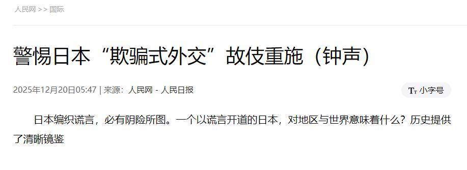 12月21日,据《人民日报》第3版发表“钟声”评论文章《警惕日本“欺骗式外交”故伎重演》,日本编造谎言,必有阴险所图。 一个善于利用谎言的日本,对地区与世界意味着什么? 历史提供了清晰镜鉴,就是日本高市政府在台湾问题上生事、生乱,将自己逼到外交死角之际。日本防卫大臣小泉进次郎大肆炒作“雷达照射”事件,先是谎称没有收到中方通报,在中亏公布录音后,又不得不改口,指责中方信息不充分。 并且与英法德加官方沟通,高市四处狡辩游说,死不悔改,变本加厉寻求外交帮助。 对待日本政府不能手软,必须以牙还牙,以其人之道,还治其人之身。