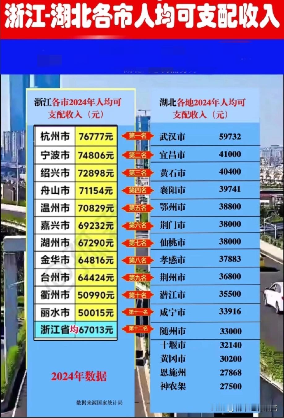 2024年浙江省各城市人均可支配收入与湖北省各城市人均可支配收入数据对比情况,整体来看浙江各城市人均可支配收入要比湖北各城市人均可支配收入更高,湖北各城市需要努力加油了。