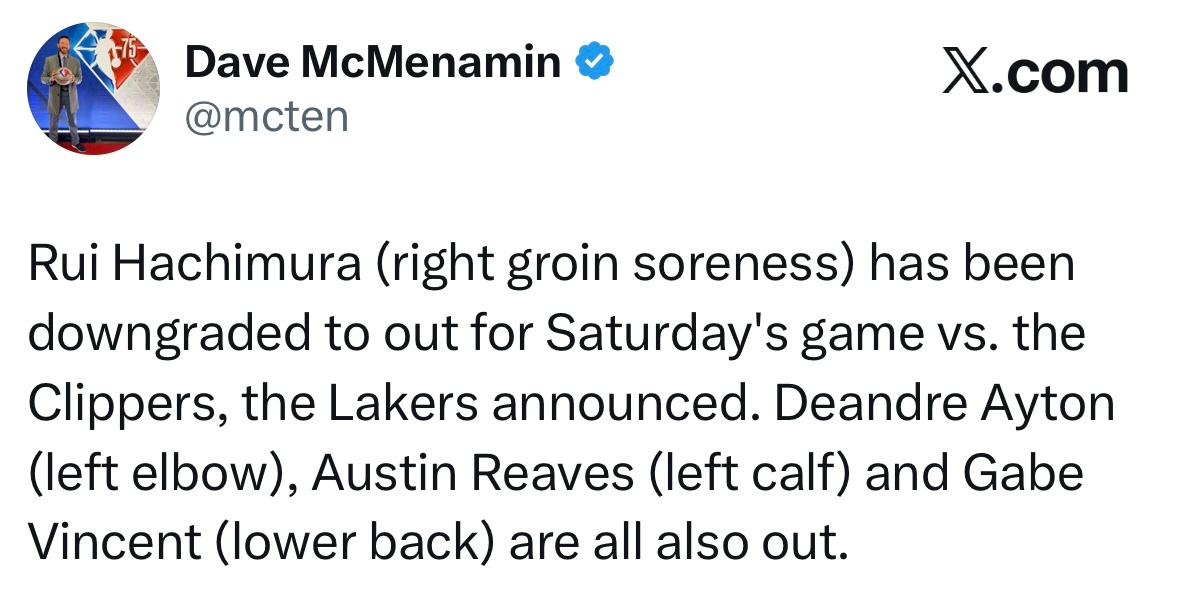 湖人对阵快船伤病报告:八村塁(右侧腹股沟酸痛)出战成疑艾顿(左肘酸痛)、里夫斯(