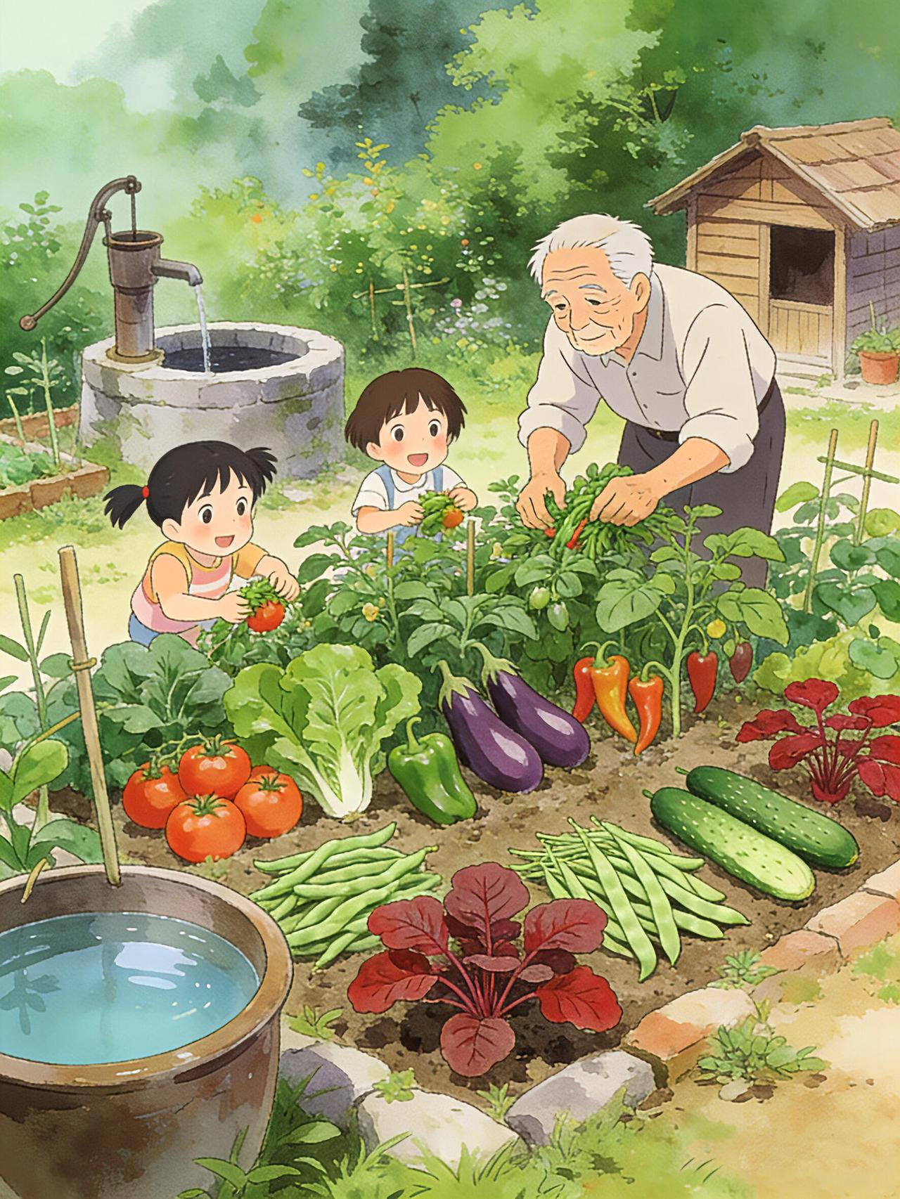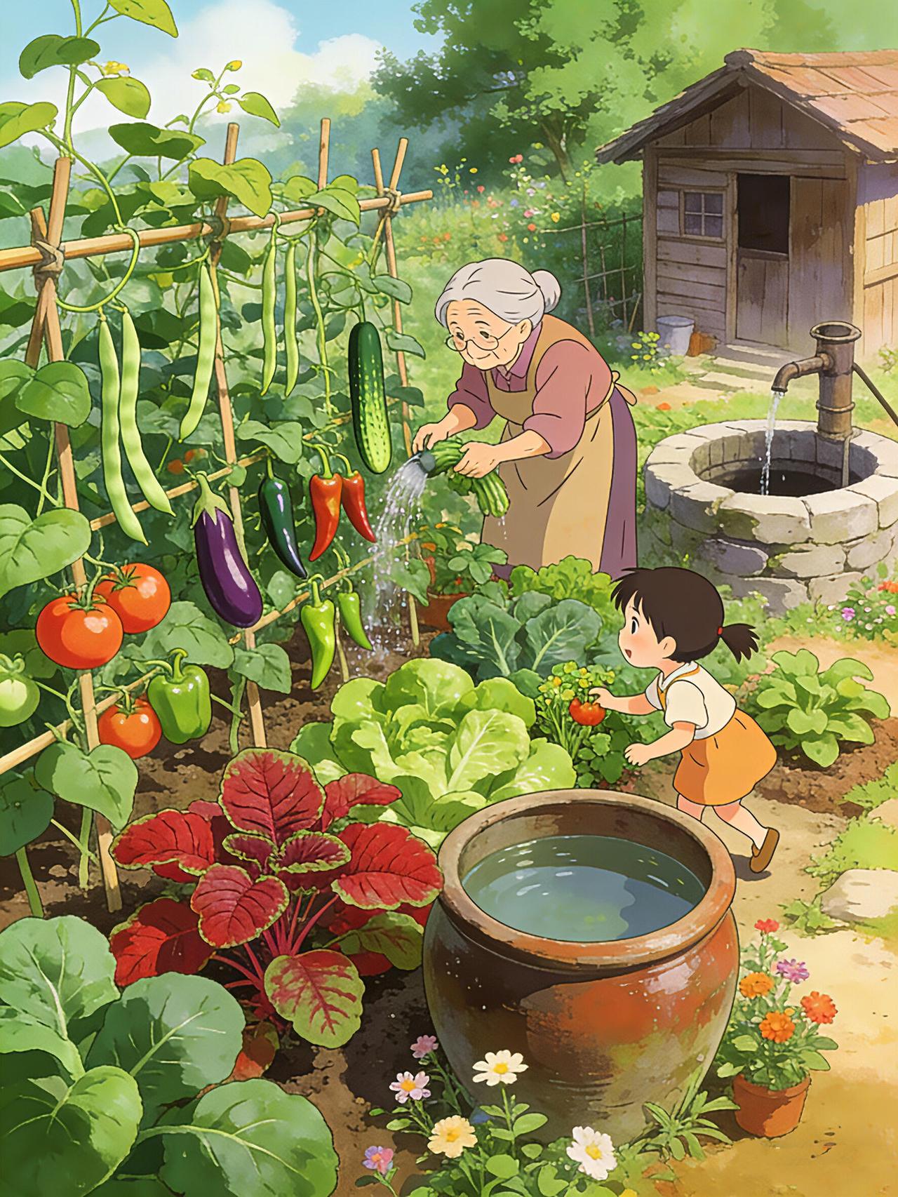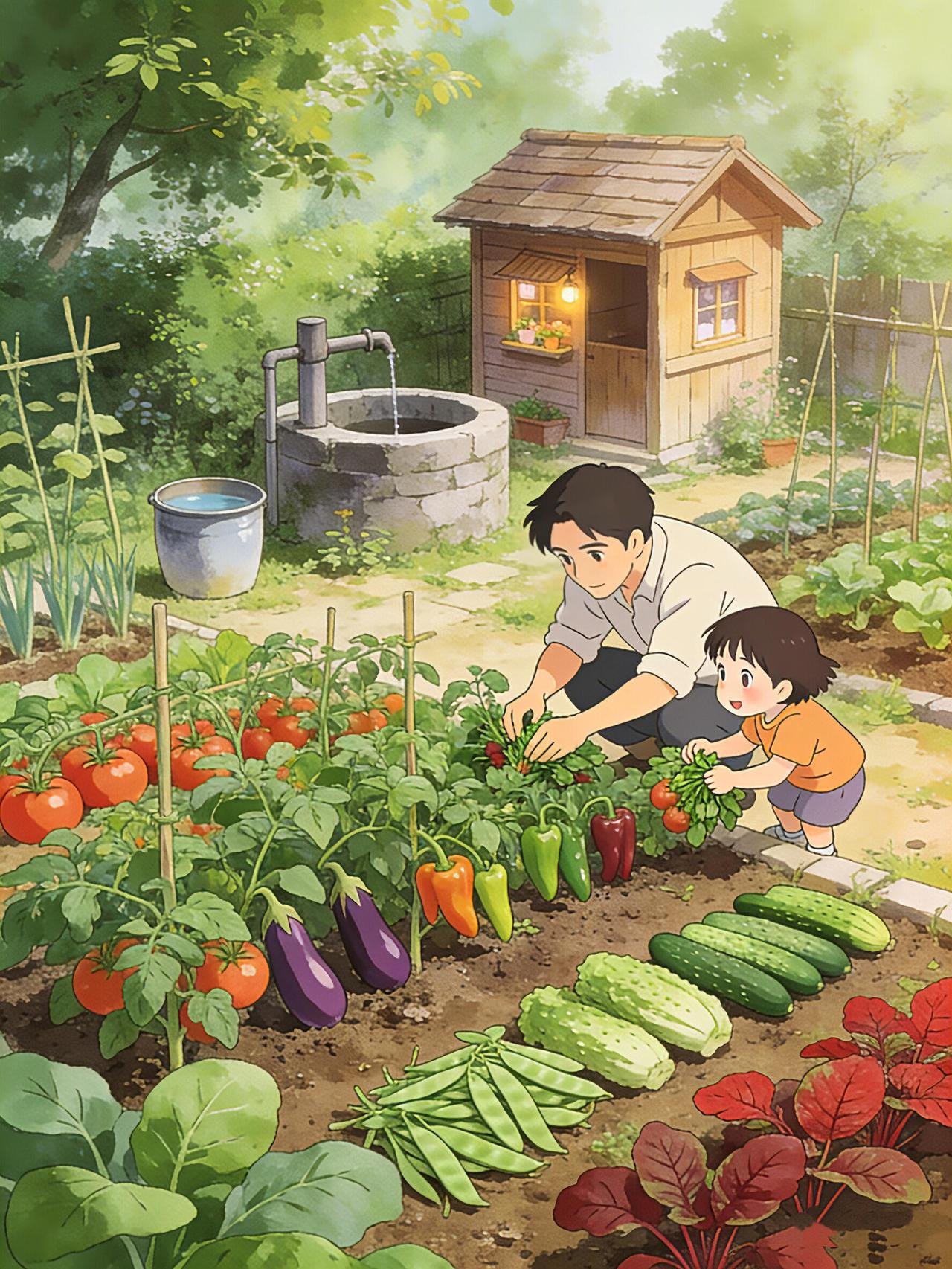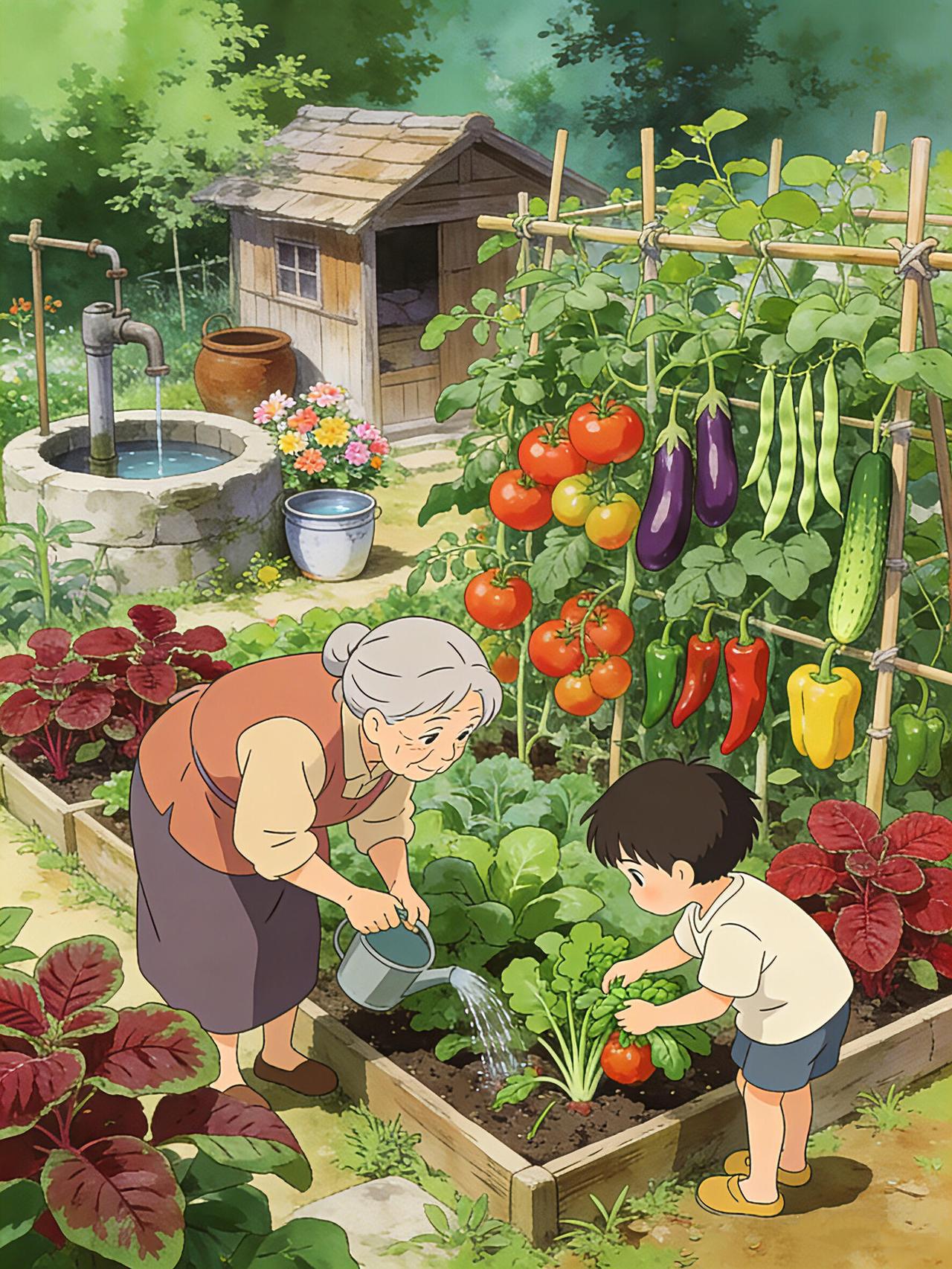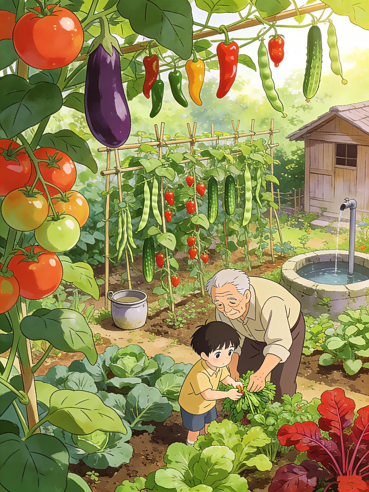 老院的菜园是夏日最鲜活的画卷。 竹架上的番茄坠着红灯笼,紫茄子垂着圆滚滚的身子,青豆角像绿绸带般垂落,彩椒藏在叶间晃着斑斓的小脸蛋。 阿公蹲在菜畦边摘菜,小孙子踮着脚扒拉叶子,指尖刚触到红透的小番茄,就被阿婆的洒水声惊得回头。井水顺着壶嘴浇在生菜上,溅起细碎的凉雾,小女孩举着刚摘的草莓跑过来,红果映着她亮亮的眼睛。 父亲也蹲下身,教儿子辨认嫩红的苋菜,竹棚下的风卷着蔬果的甜香,老井的水声叮咚,把夏日的温柔,都揉进了这方小小的菜园里。