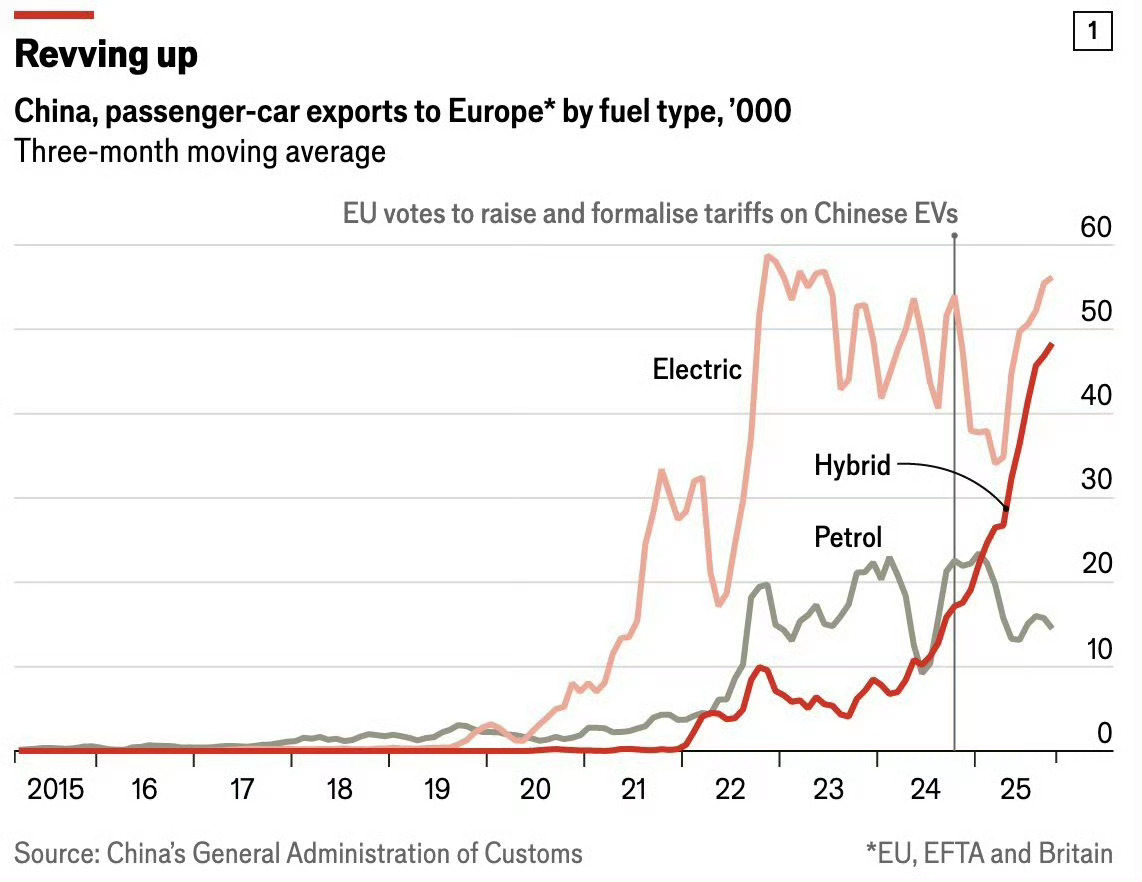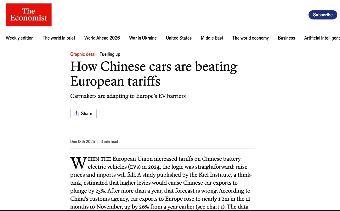 中国汽车是如何突破欧洲关税壁垒并占领欧洲。2024年当欧盟提高对中国电池电动汽车的关税时,其逻辑非常直接:提高价格,进口就会下降。基尔研究所发表的一项研究估计,更高的税收会导致中国汽车出口骤降25%。一年多后,这一预测被证明是错误的。根据中国海关总署的数据,在截至11月的12个月里,出口到欧洲的汽车数量上升至近120万辆,同比增长26% 。数据表明,欧洲未能遏制中国制造汽车的崛起,与其说是关税力度不够,不如说是中国车企拥有规避关税的天赋。欧洲的电动汽车关税旨在解决欧盟委员会所称的中国生产商接受国家“不公平补贴”的问题,并恢复“公平竞争环境”。但欧盟并没有对所有中国汽车征收统一的关税,而是选择了量身定制的方法。根据每家车企受政府支持的估计程度,额外关税仅适用于纯电池驱动的车辆。在该贸易集团现有10%的进口税基础上,比亚迪(中国最大的电动汽车生产商)面临额外17%的关税,吉利旗下品牌为18.8%,上汽集团为35.3%。其他中国车企则被征收20.7%的关税。混合动力汽车则得以幸免。中国汽车制造商并没有退缩,而是改变了赛道,从电动汽车转向混合动力汽车,后者结合了电动机和汽油发动机。这种转变在数据中显而易见。尽管过去一年中国对欧洲的电动汽车月销量增长了12%,但混合动力汽车的出口量却激增了155%,尽管这是在基数较低的情况下实现的。德国汽车研究中心的贝娅特丽克丝·凯姆最近告诉德国报纸《商报》:“中国制造商改变策略只是时间问题。”混合动力汽车目前是中国汽车出口增长最快的领域,已经超过了纯电动车型。这种效应在欧洲的展厅中已经显现。根据数据提供商Dataforce的数据,10月份中国品牌占欧洲大陆混合动力汽车销量的13%,高于一年前的仅3%。在此期间,它们在电动汽车市场的份额从8%跃升至12%。在全球范围内,混合动力汽车目前占中国客运车辆出口的三分之一。按照目前的趋势,它们将超过电动汽车和汽油车。事实证明,中国汽车制造商非常擅长应对障碍。热点现场海外新鲜事