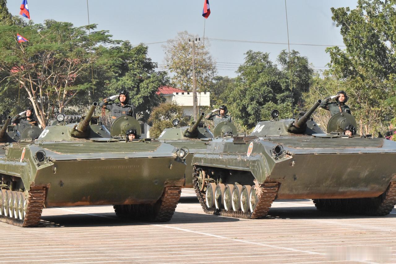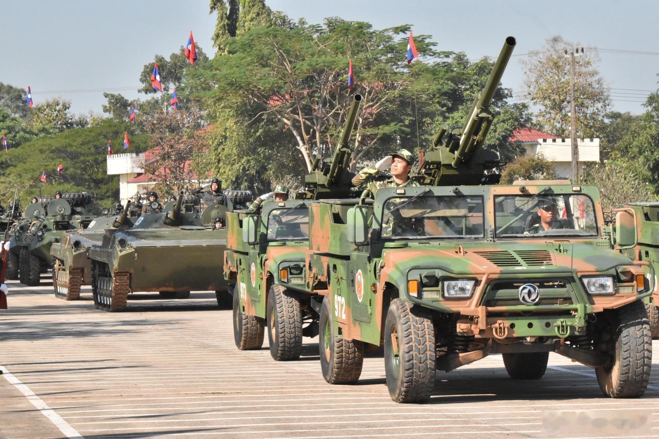 老挝纪念第11机械化步兵营成立50周年阅兵仪式,展示CS/SS4型82mm速射迫击炮、东风猛士EQ2050型越野车等装备