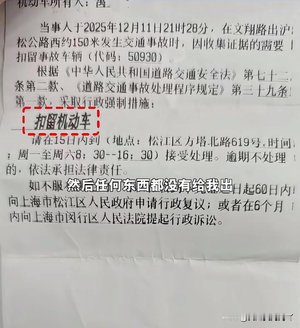 一起交通事故来了两方交警,诡异的是两方交警对于同一起交通事故做出了两份完全相反的责任认定 12月11号事发上海,禹先生表示当晚他在道路中间车道直行,右侧车辆打左转灯后随即变道到中间车道导致两车剐蹭,禹先生报警后所属片区街道出警,交警到场后结合行车记录仪视频判定变道车全责。变道车辆司机对此不认同报警来的却是不属事故发生地片区的第一大队交警,到场后在不看行车记录仪视频的前提下判定直行车辆全责 现在就双方对于事故认定不认同导致车辆被扣留,禹先生表示非常不能理解而且到现在没有给他任何说法只有一张车辆扣留单,事故责任认定书也没有拿到 我也不能理解,交警处理交通事件不是有统一的处理依据吗?怎么会出现一场事故两种截然不同的判法 大家觉得这起因变道导致的剐蹭责任究竟在谁?