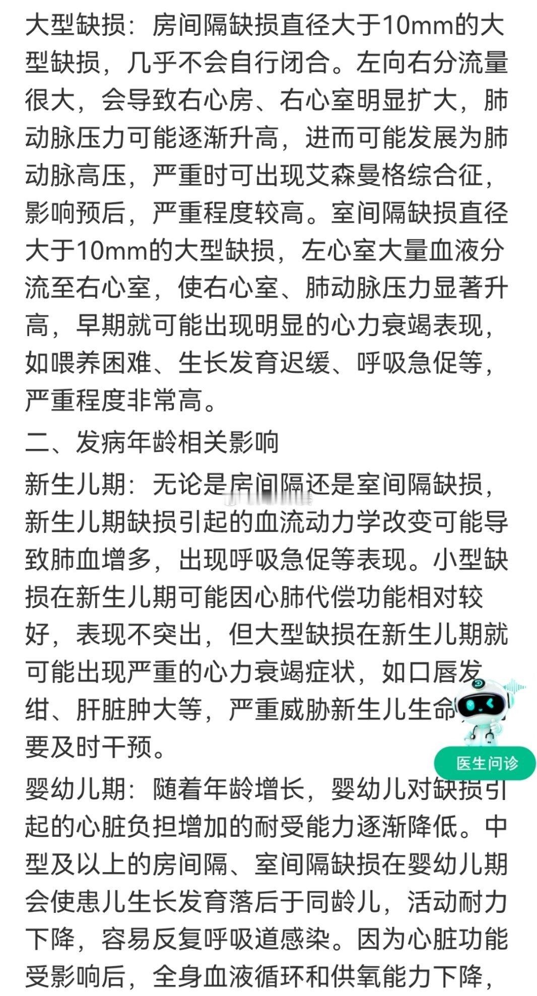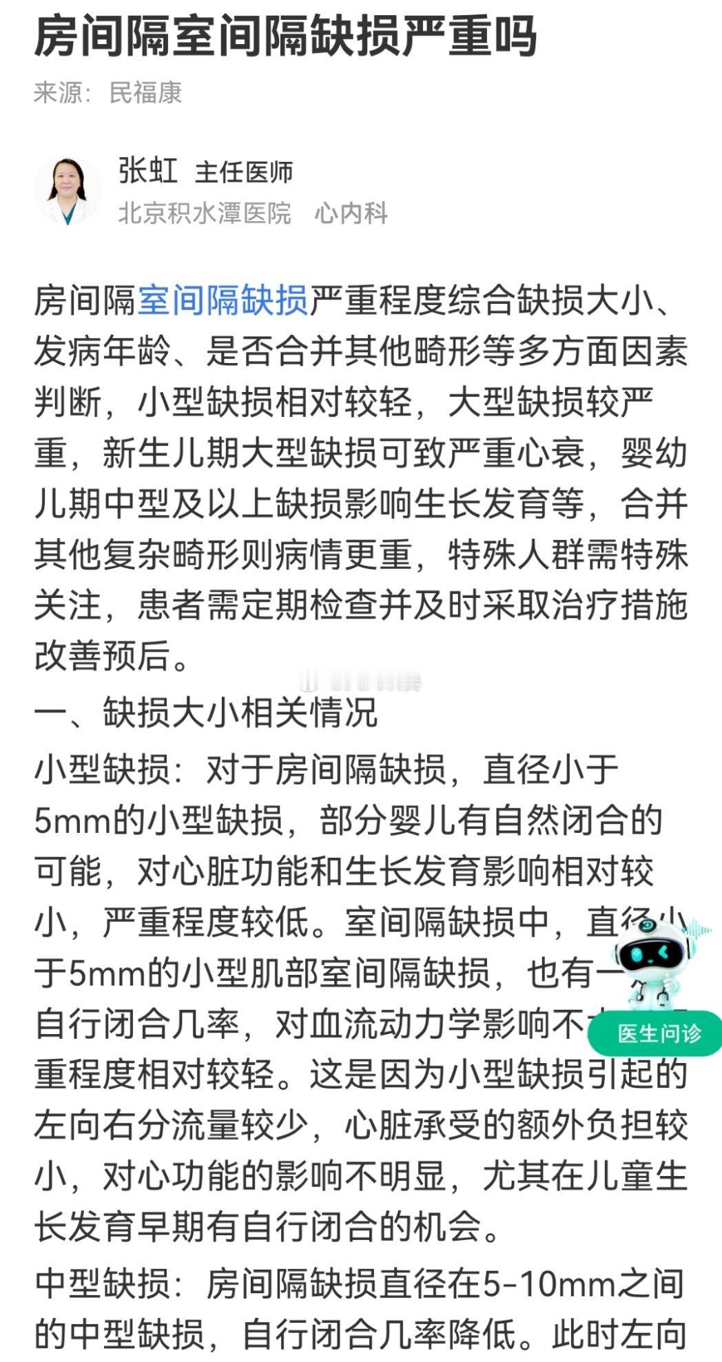 1cm房间隔缺损对5个月患儿影响较大找了一篇事件之前医生的科普文章,大体了解了一下。小型缺损:直径小于5mm的小型缺损,部分婴儿有自然闭合的可能,对心脏功能和生长发育影响相对较小,严重程度较低。。中型缺损:房间隔缺损直径在5-10mm之间的中型缺损,自行闭合几率降低。长期可引起左心扩大等情况,严重程度高于小型缺损。大型缺损:房间隔缺损直径大于10mm的大型缺损,几乎不会自行闭合。严重时可出现艾森曼格综合征,早期就可能出现明显的心力衰竭表现,如喂养困难、生长发育迟缓、呼吸急促等,严重程度非常高。热点观点