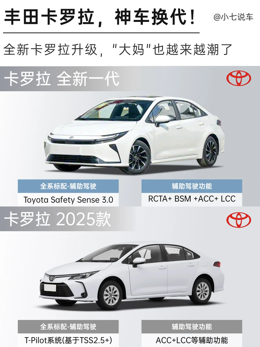 4️⃣外观内饰更有档次,前脸换成了丰田最新的锤头鲨样式,分体式日行灯+大尺寸格栅,看着不像老款那么沉稳,年轻多了;🚘并且中配就有皮质座椅、无钥匙进入,入门版也标配8个安全气囊,以前入门款的简陋感彻底没了