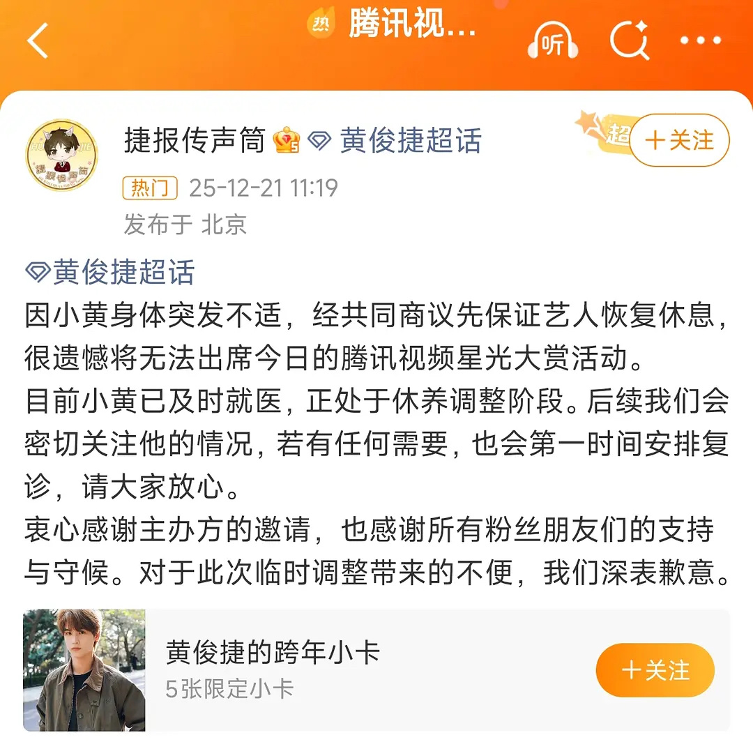 丁禹兮黄俊捷缺席星光大赏红毯丁禹兮工作室黄俊捷工作室今日均发文将缺席星光大赏红毯,一定要好好休息啊!丁禹兮黄俊捷将缺席星光大赏红毯星光大赏红毯