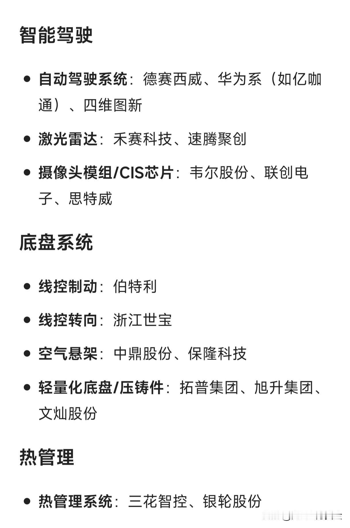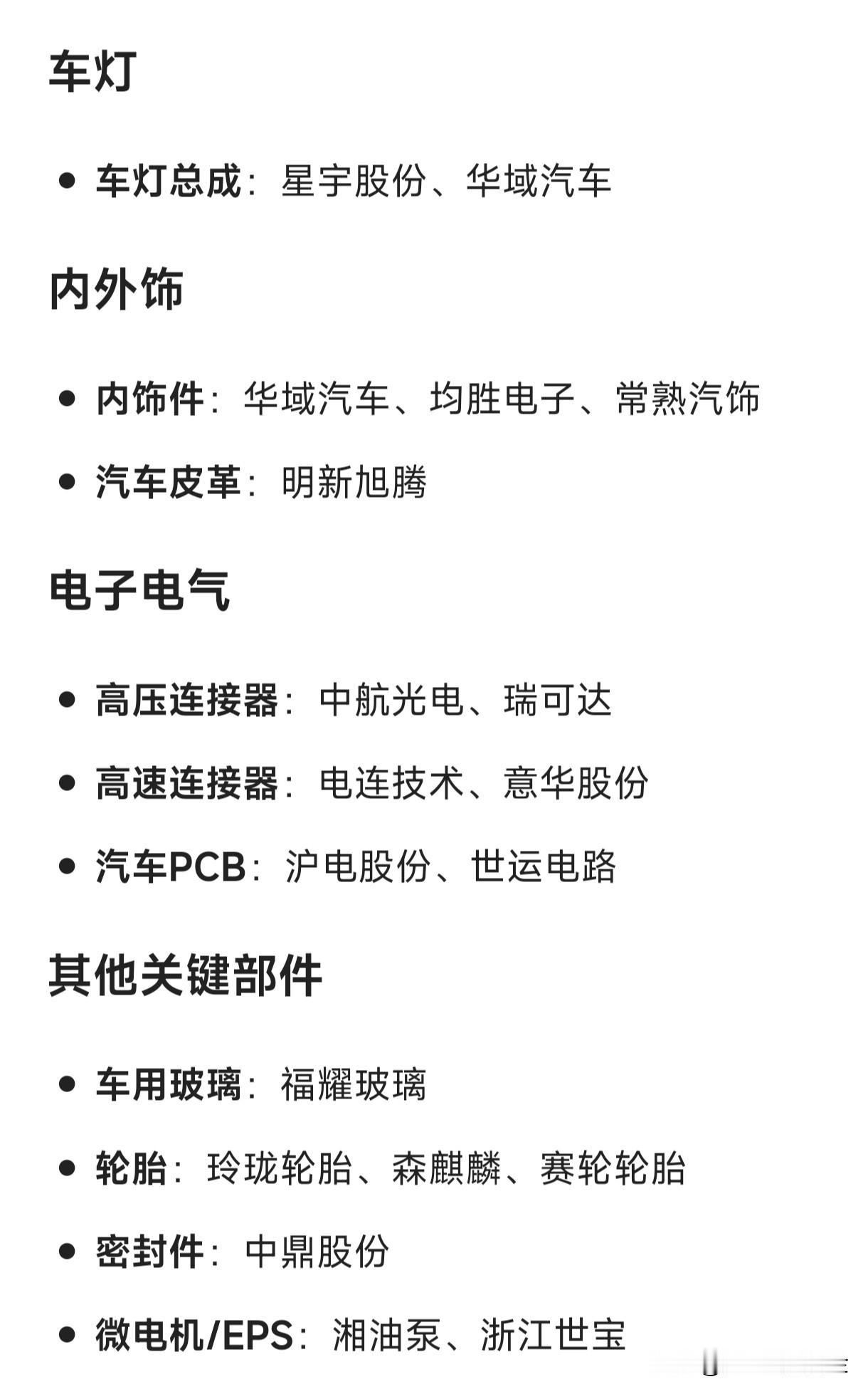 汽车零部件细分龙头代表企业 三电系统 动力电池:宁德时代、比亚迪(弗迪电池) 电机:汇川技术、卧龙电驱、方正电机 电控:汇川技术、菱电电控 充电与能源 充电桩:许继电气、山东威达 车载电源:威迈斯、欣锐科技 智能座舱 座舱域控制器:德赛西威、均胜电子、华阳集团 车载显示/触控:京东方、深天马、联创电子、汇顶科技 智能驾驶 自动驾驶系统:德赛西威、华为系(如亿咖通)、四维图新 激光雷达:禾赛科技、速腾聚创 摄像头模组/CIS芯片:韦尔股份、联创电子、思特威 底盘系统 线控制动:伯特利 线控转向:浙江世宝 空气悬架:中鼎股份、保隆科技 轻量化底盘/压铸件:拓普集团、旭升集团、文灿股份 热管理 热管理系统:三花智控、银轮股份 车灯 车灯总成:星宇股份、华域汽车 内外饰 内饰件:华域汽车、均胜电子、常熟汽饰 汽车皮革:明新旭腾 电子电气 高压连接器:中航光电、瑞可达 高速连接器:电连技术、意华股份 汽车PCB:沪电股份、世运电路 其他关键部件 车用玻璃:福耀玻璃 轮胎:玲珑轮胎、森麒麟、赛轮轮胎 密封件:中鼎股份 微电机/EPS:湘油泵、浙江世宝