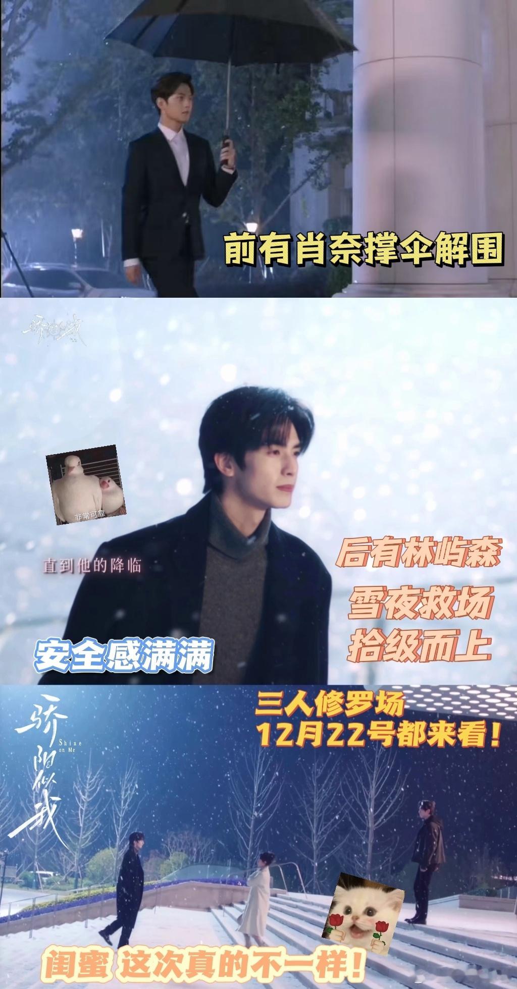 前有肖奈撑伞后有林屿森救场 顾漫的笔下总是充满了浪漫与惊喜,肖奈的伞和林屿森的步履就是最好的诠释。宋威龙和赵今麦的搭配太完美了,雪中氛围感让人仿佛置身于童话世界,12月22日一起见证这份爱情奇迹!