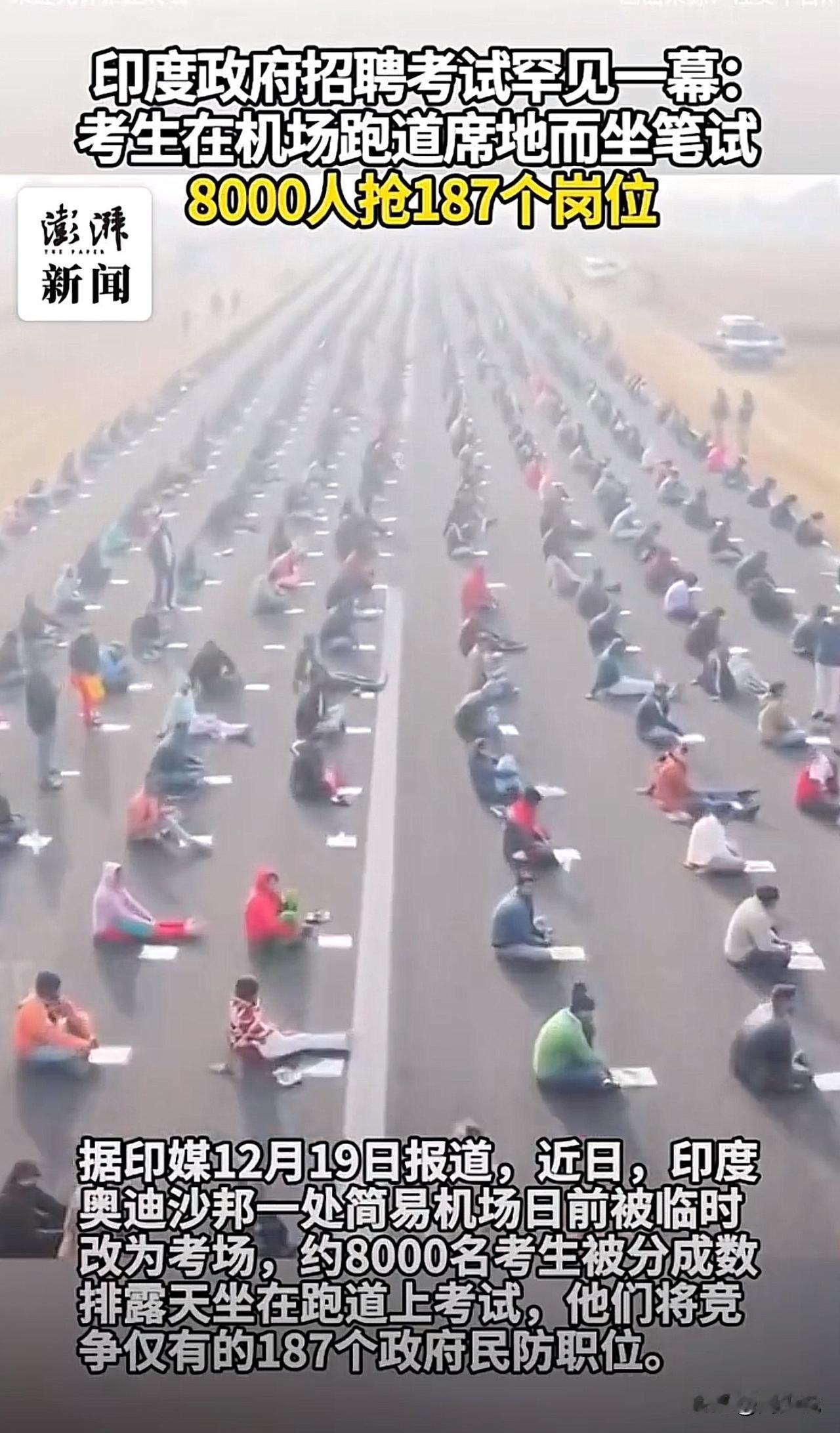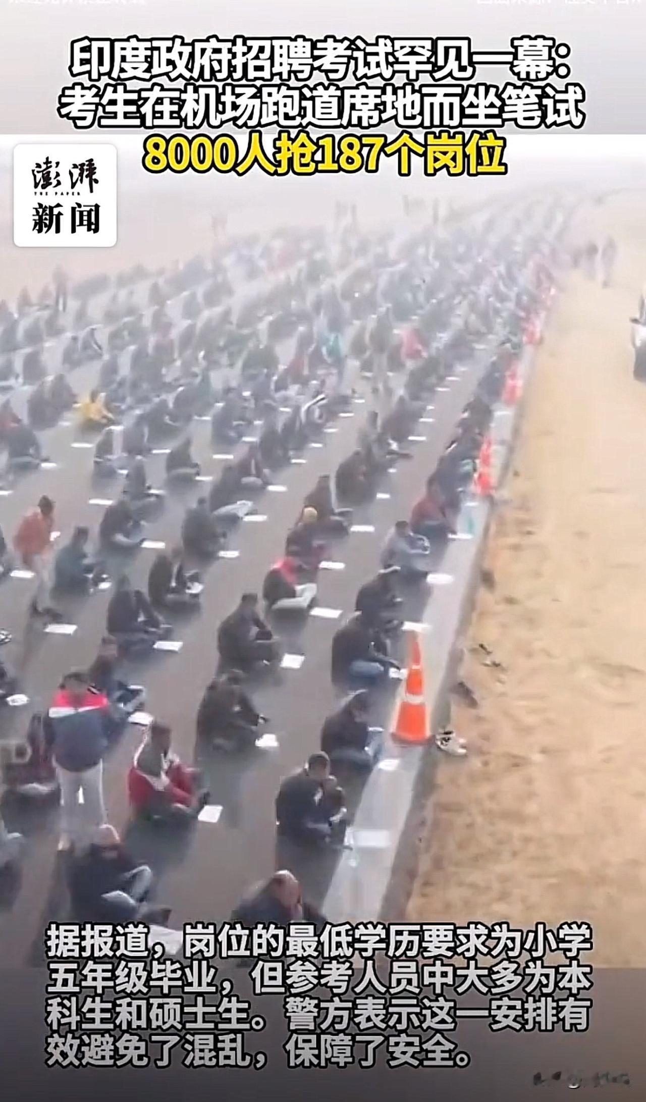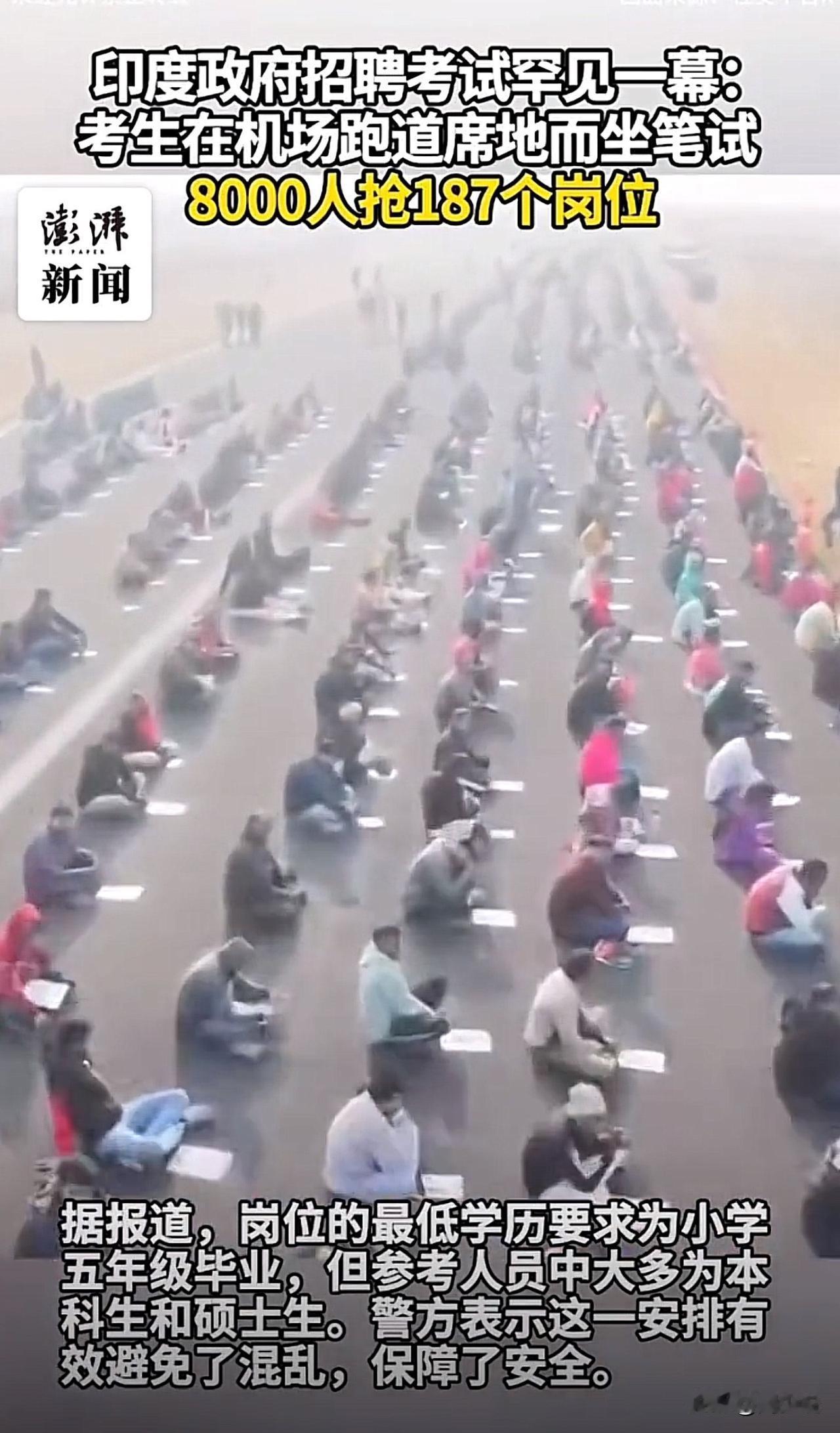 “不愧是印度!”据印媒报道,奥迪沙邦一处简易机场被临时改成考场,8000名考生分排露天坐在跑道上笔试,90分钟里为187个政府民防职位展开角逐。让人唏嘘的是,岗位最低要求仅小学五年级毕业,可参考者中满是本科生、硕士生。警方称此举是为了避免混乱、保障安全。 视频曝光后,不少网友纷纷表示:“这才是真正的内卷!高学历抢基础岗,太能体会这种无奈了”! 这一幕,在周少看来,其实真实戳中了教育与就业的核心矛盾。高学历群体争抢低门槛岗位,本质是优质资源供给不足与上升通道狭窄的缩影。 教育不该只培养“考试机器”,更要注重能力与需求的匹配;而社会也需搭建更多元的发展平台,让不同学历、不同能力的人都能找到价值坐标。 同时这也提醒我们,无论竞争多激烈,保持终身学习的能力、找准自身定位,远比盲目追逐“热门岗位”更重要。#寻美三湘# #长沙新朋友#