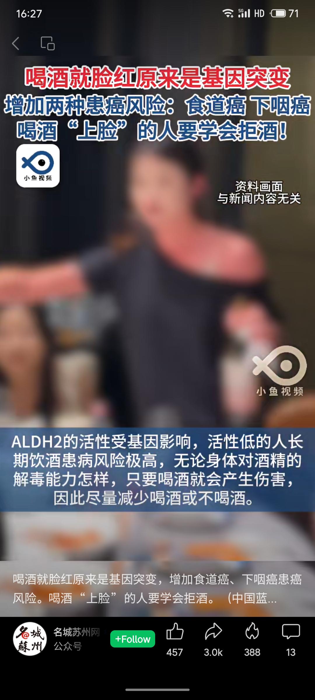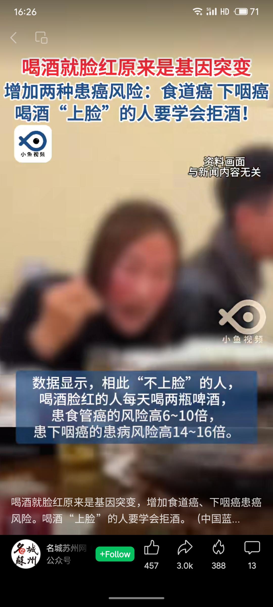 喝酒脸红源于ALDH2基因突变,导致致癌物乙醛堆积。此类人群长期饮酒会使食道癌、下咽癌风险显著增加(最高达16倍)。建议“上脸”者学会拒酒以减少伤害。