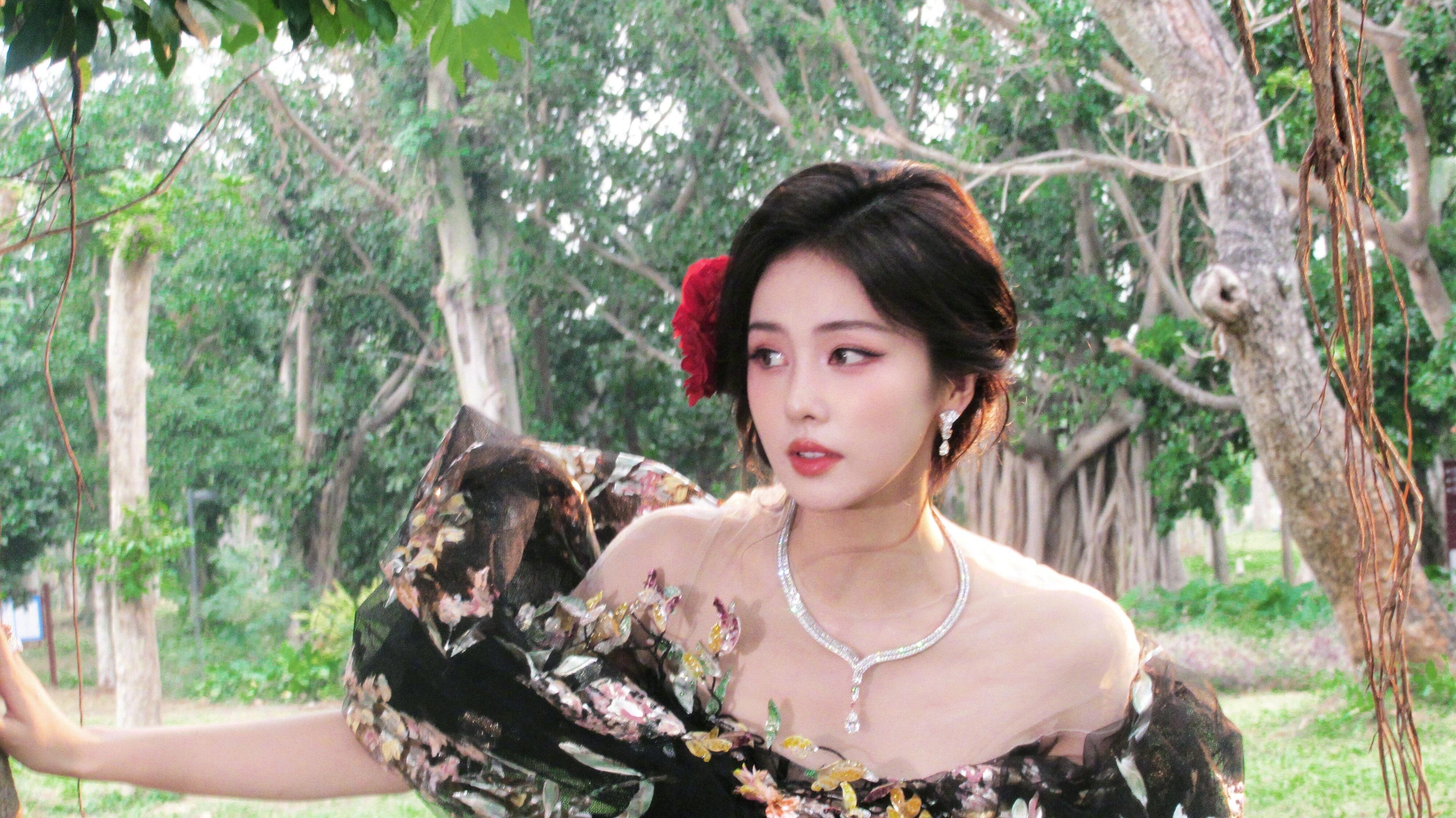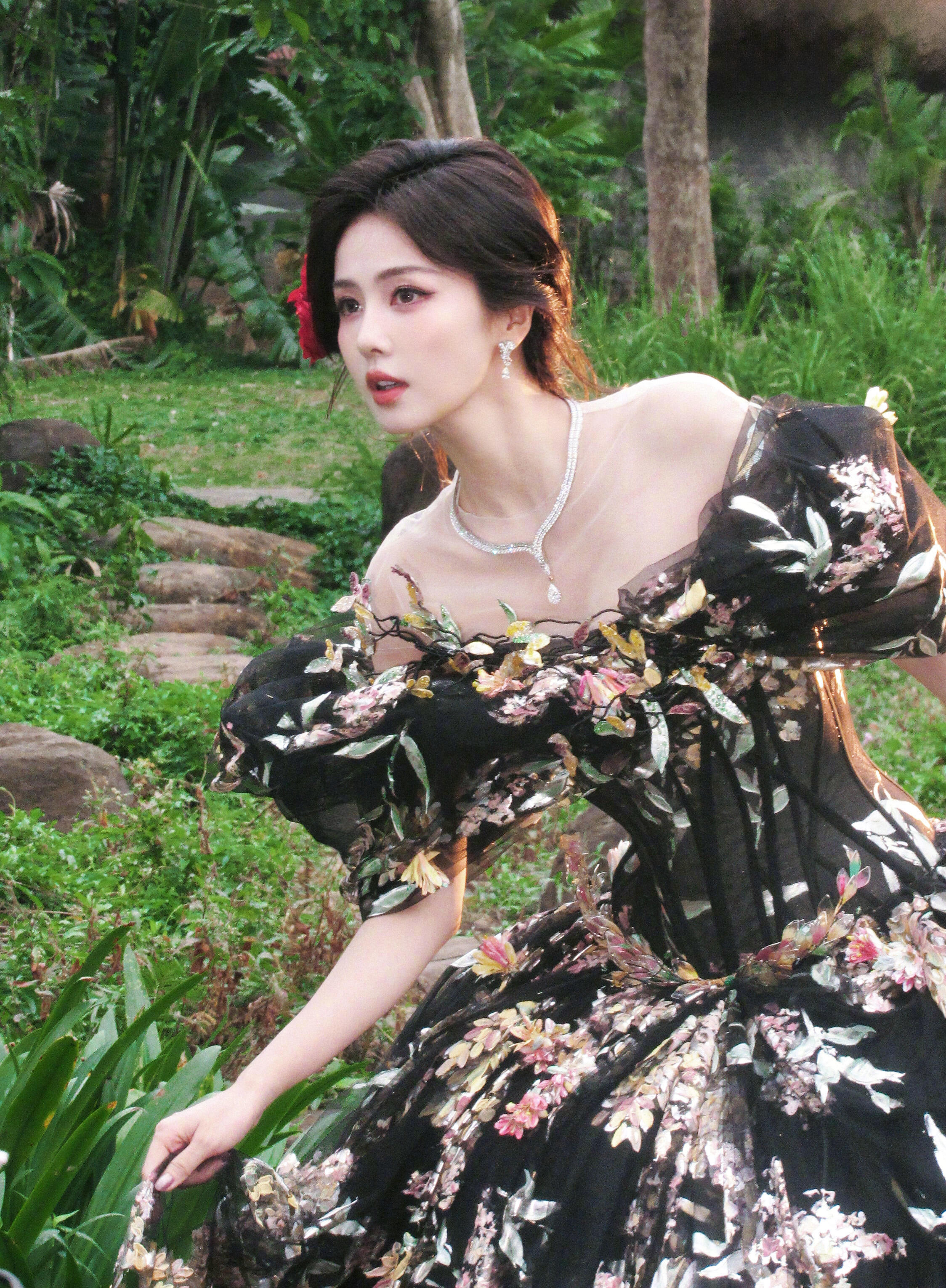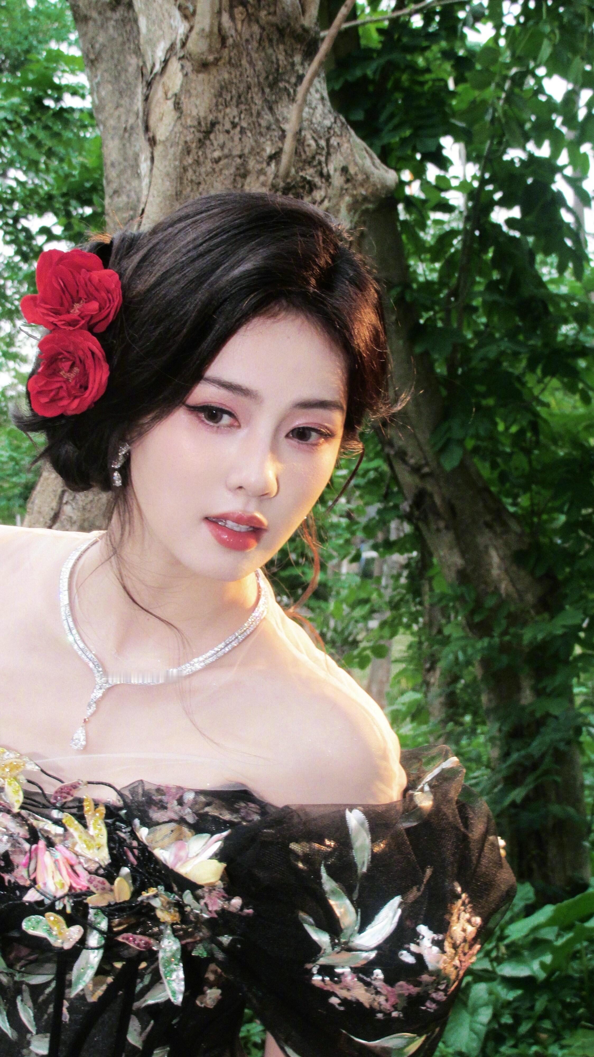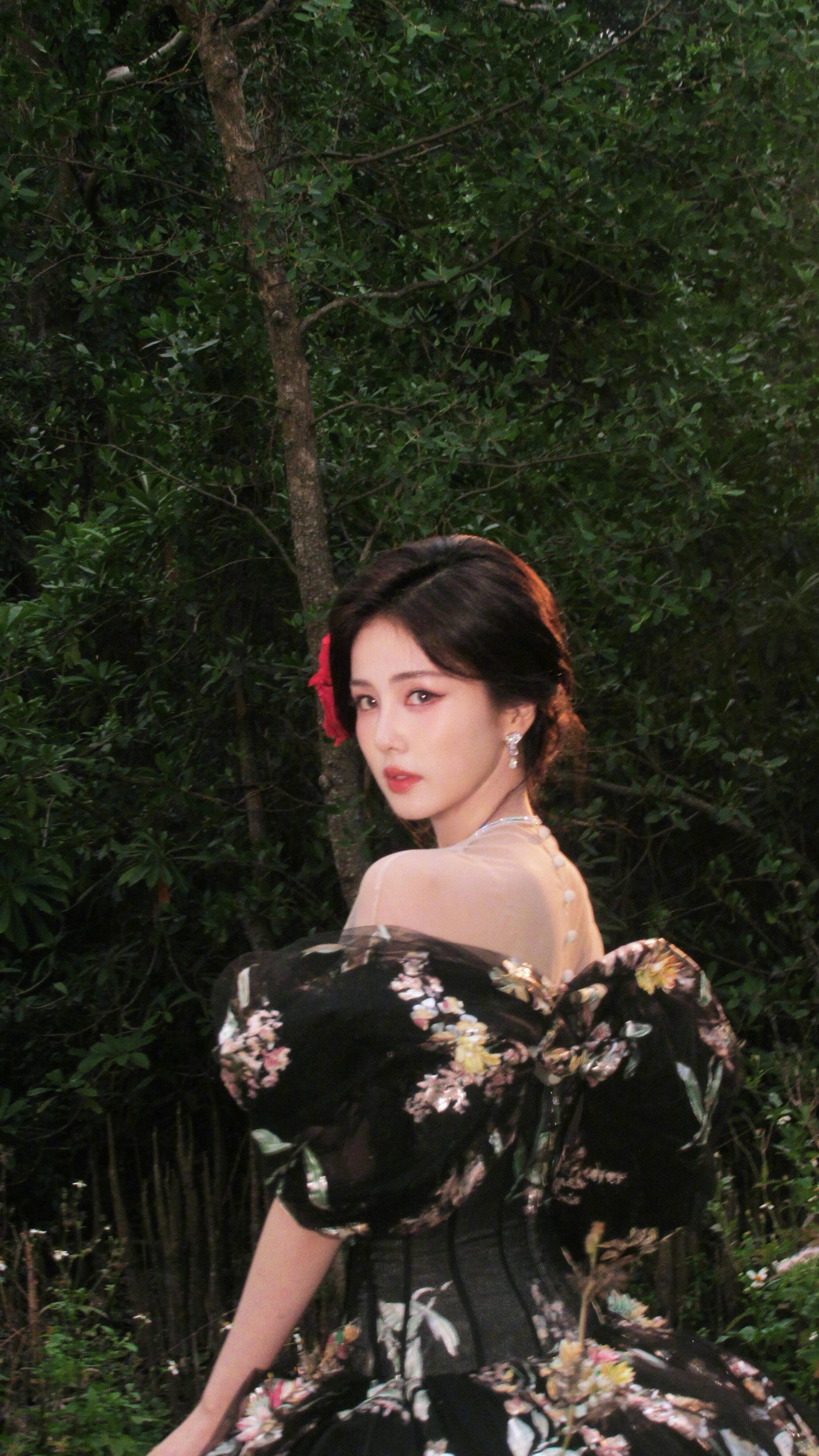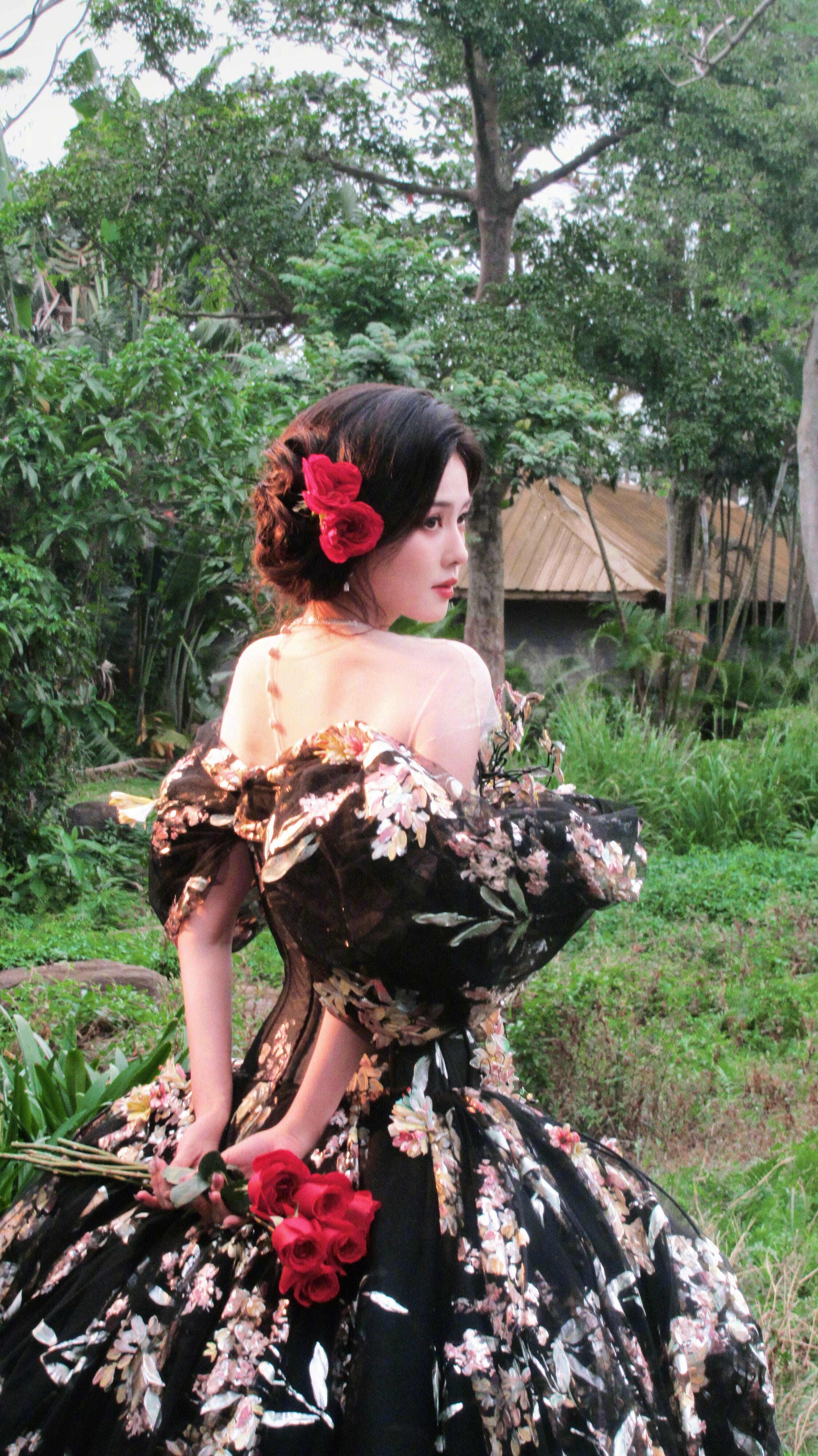 黑裙繁花配红玫,简直就是从油画里走出来的暗夜玫瑰