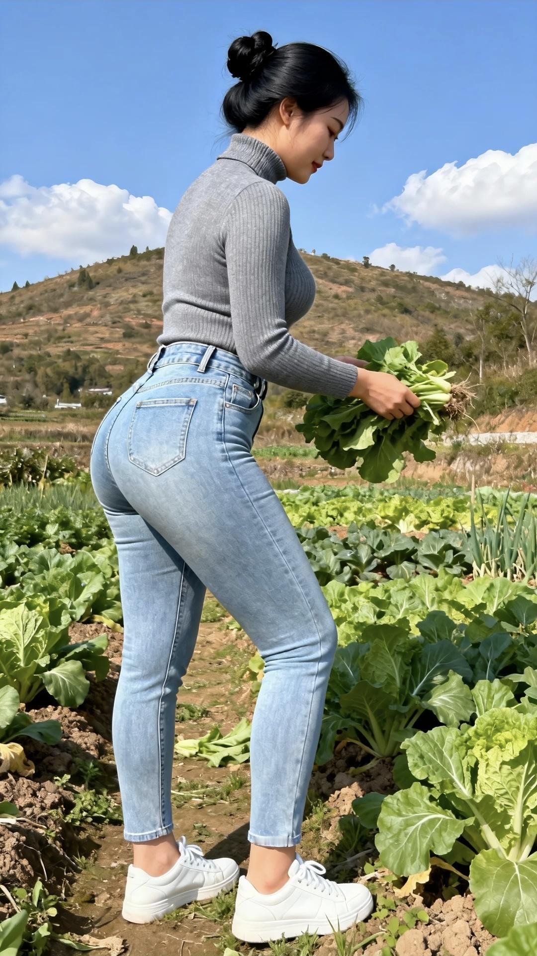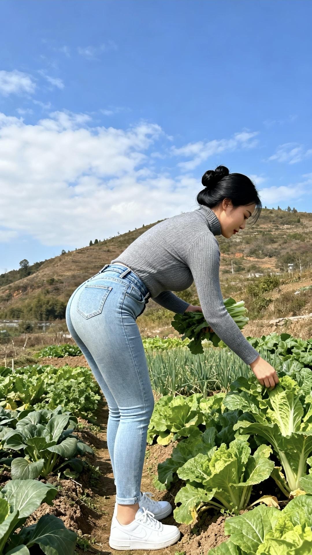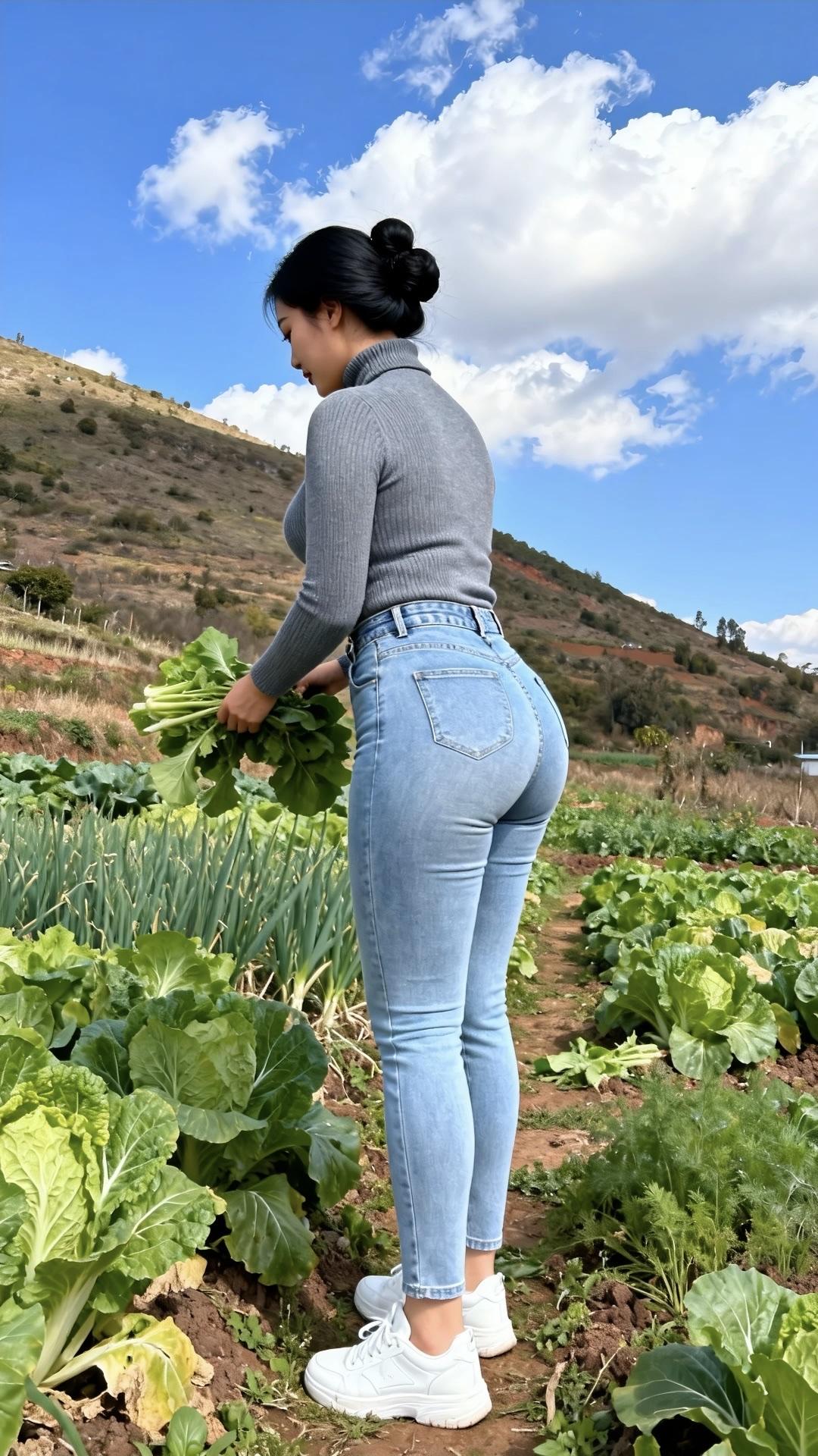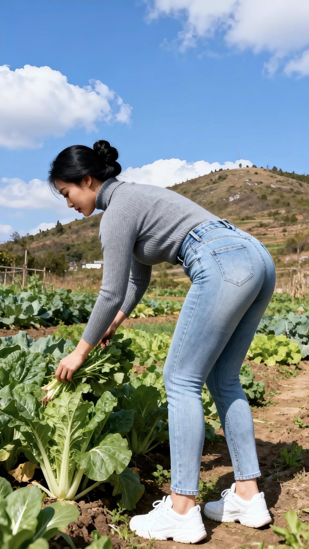 澄澈的蓝天缀着棉絮状的云,远山的坡地覆着浅褐与苍绿交织的肌理,菜畦里的白菜舒展着嫩黄与鲜绿相间的叶片,泥土的腥甜混着蔬果的清润在风里漫开,俯身的动作轻缓地触碰着菜梗,指尖捻起菜叶的瞬间,像是与土地的生机温柔相握,葱苗在旁亭亭而立,添了田亩的鲜活,每一个采摘的姿态都融进郊野的烟火里,平凡的劳作时刻,便在这晴日的菜畦间,漾出淡淡的诗意与土地孕育生机的清甜美好。农村