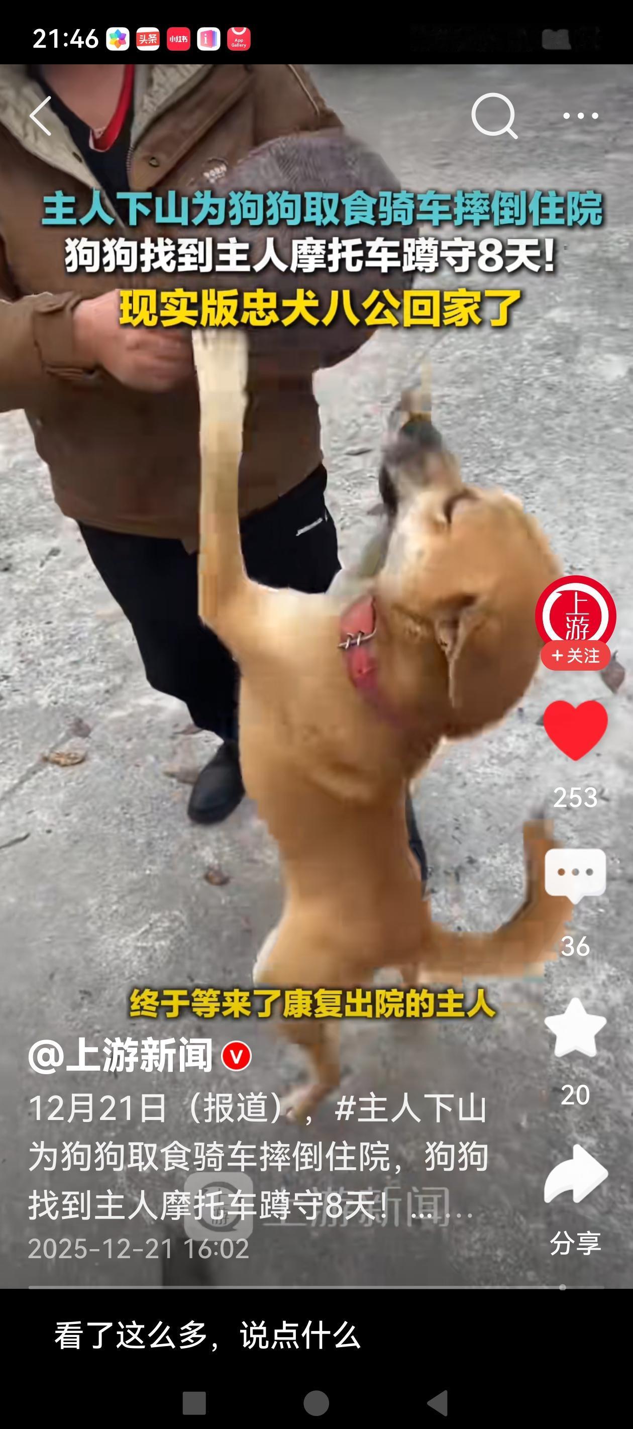 狗狗摩托车旁蹲守8天 这只名叫“来福”的狗狗对主人太忠诚了。在农村农家养狗就是为了看家护院,而不是当宠物养,养的时间长了,狗和主人自然也就有了感情。 据红心新闻报道,12月11日,狗主人骑摩托车下山为“来福”取食,返程途中不慎摔倒受伤,被紧急送到医院。就医前,他把摩托车停在了路边的一家兰花店旁。第二天,家人发现“来福”不见了,原来它找到了主人的摩托车,就日夜守在摩托车旁不肯离去。兰花店之人和周围的群众被感动了,就在路旁给它搭了个小窝,并拿来食物投喂。8天后,“来福”终于等来了出院的主人。 人与动物的感人故事不只是出现在文学作品中,在现实生活中也在上演。人与自然、人与动物,和谐共生是永恒的主题!