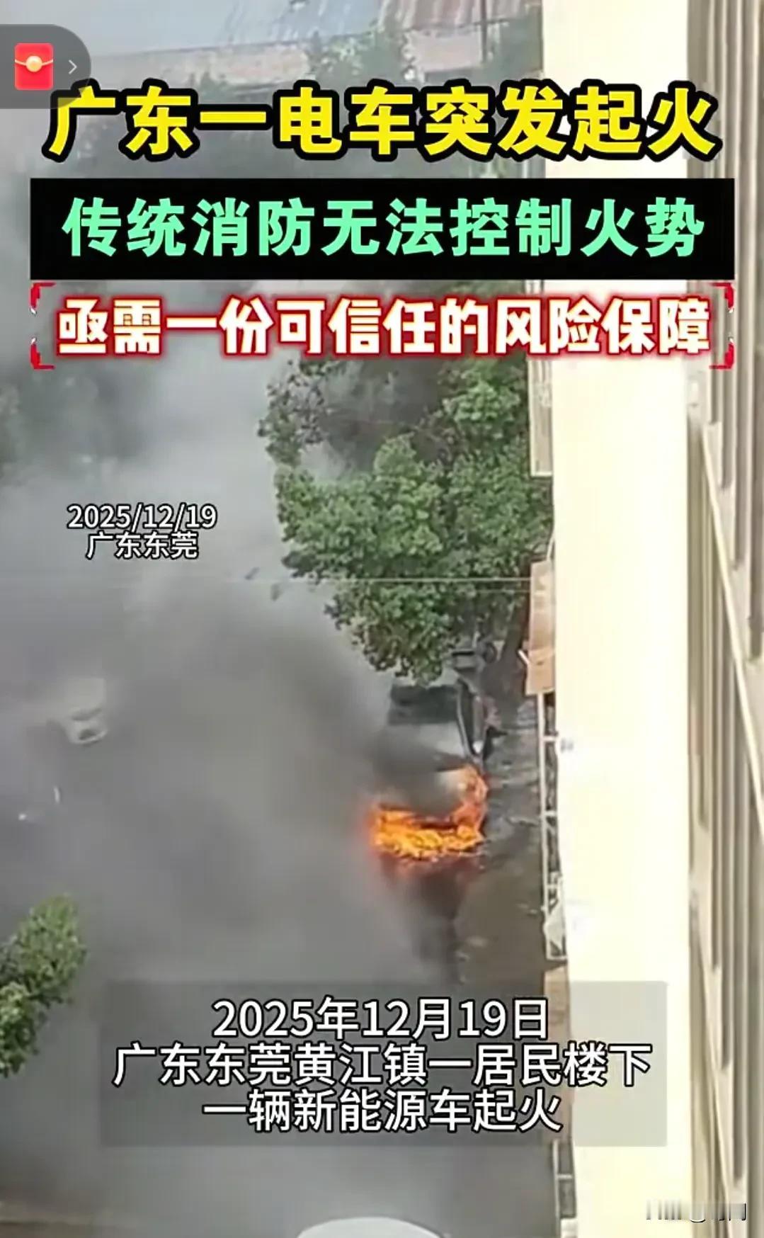 一新能源汽车停放状态下起火,网友表示幸亏没有停在地下室,否则又是重大事故。事发12月19日,在广东省东莞市黄江镇一处小区居民楼的道路上,一辆停在树下的新能源汽车突然燃起大火。 据拍摄视频的居民说,这辆车当时车上没人,也不清楚好久停在这里的,自己也是听到外面传出啪啪声音才发现起火的,随后就打了报警电话后拍摄了视频,具体是什么品牌也没看清楚。 现场视频显示火势很大,大树都被烧焦一大半,旁边一辆电瓶车也被烤得外壳变形。后来消防人员到达扑灭火势,但是车辆已经报废完全。当地居民称还好没停地下停车场,否则后果太可怕了。 郑重提示,如果帖子后面不见了,那就是车辆厂家通过不法手段进行了删帖,掩盖自家品牌车辆起火事实,试图造成自家车辆从没发生过起火的假象,蒙骗消费者购买。 广东东莞一小区内新能源汽车起火