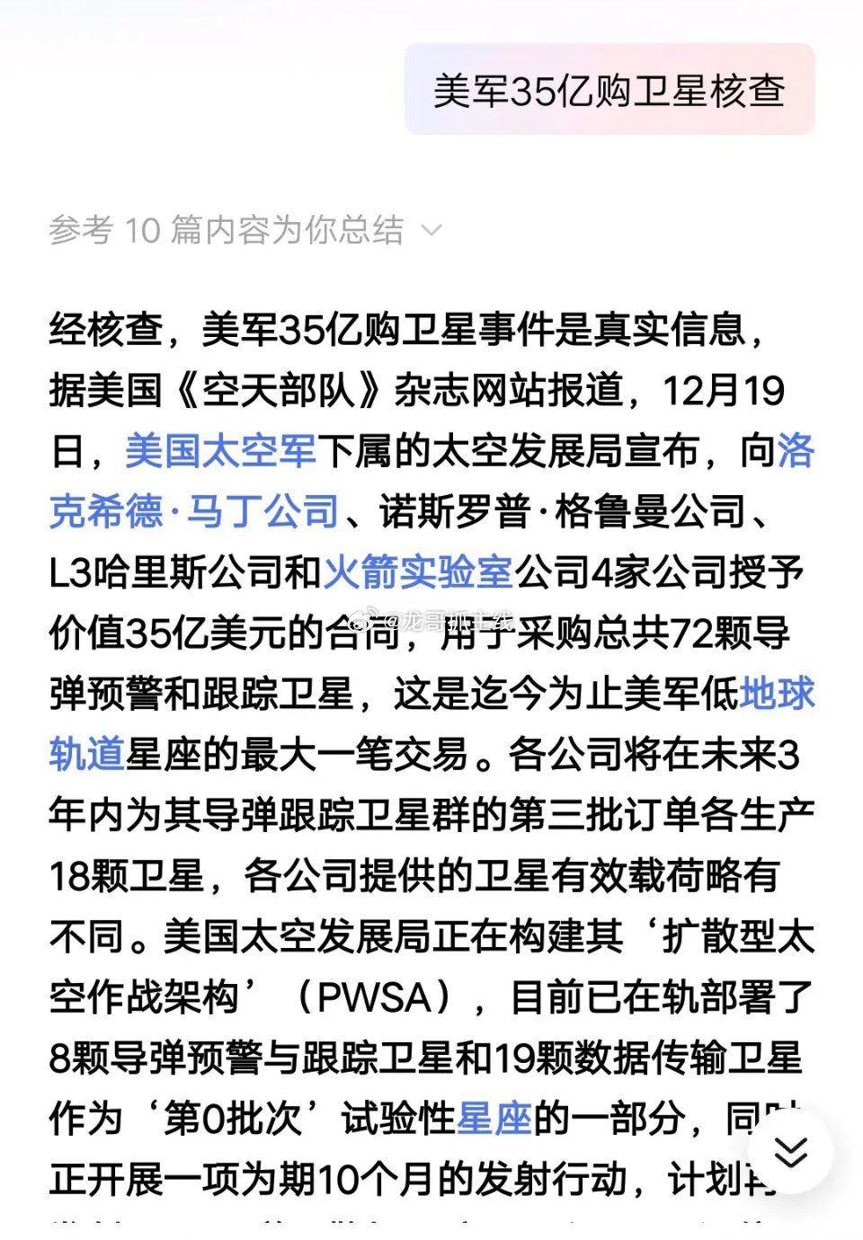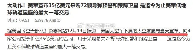 航天军工重磅利好,消息已经得到证实周末,外网一则消息传的沸沸扬扬,美军35亿美元采购卫星。美国太空军下属的太空发展局宣布,向洛克希德·马丁公司、诺斯罗普·格鲁曼公司、L3哈里斯公司和火箭实验室公司4家公司授予价值35亿美元的合同,用于采购总共72颗导弹预警和跟踪卫星。商业航天是近期市场的热门题材,已经走出了多个龙头股,很多散户吃了大肉,空间以及辨识度都有了。此消息又给板块加了一把柴,下周接着奏乐接着舞。当然,风险也是有的,谨慎看多。微博股票