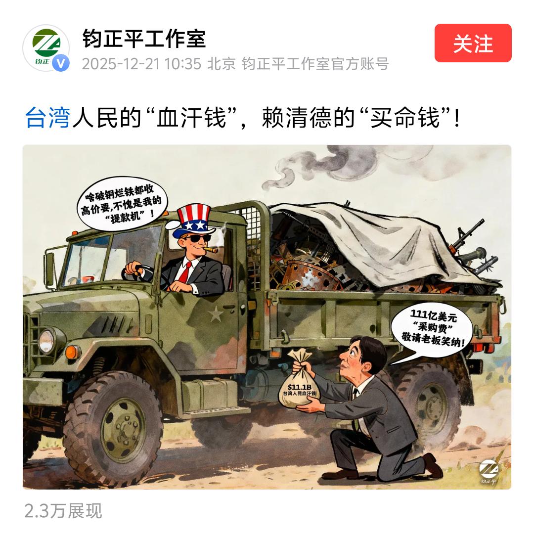 台湾人民的“血汗钱”,赖清德的“买命钱”!12月21日,钧正平工作室发表一幅漫画,并配文如上。其实,在这短短的一句话背后,我们分明能看见还写着另外一句没有说出来的话:再多的“买命钱”,也护不住他的周全!