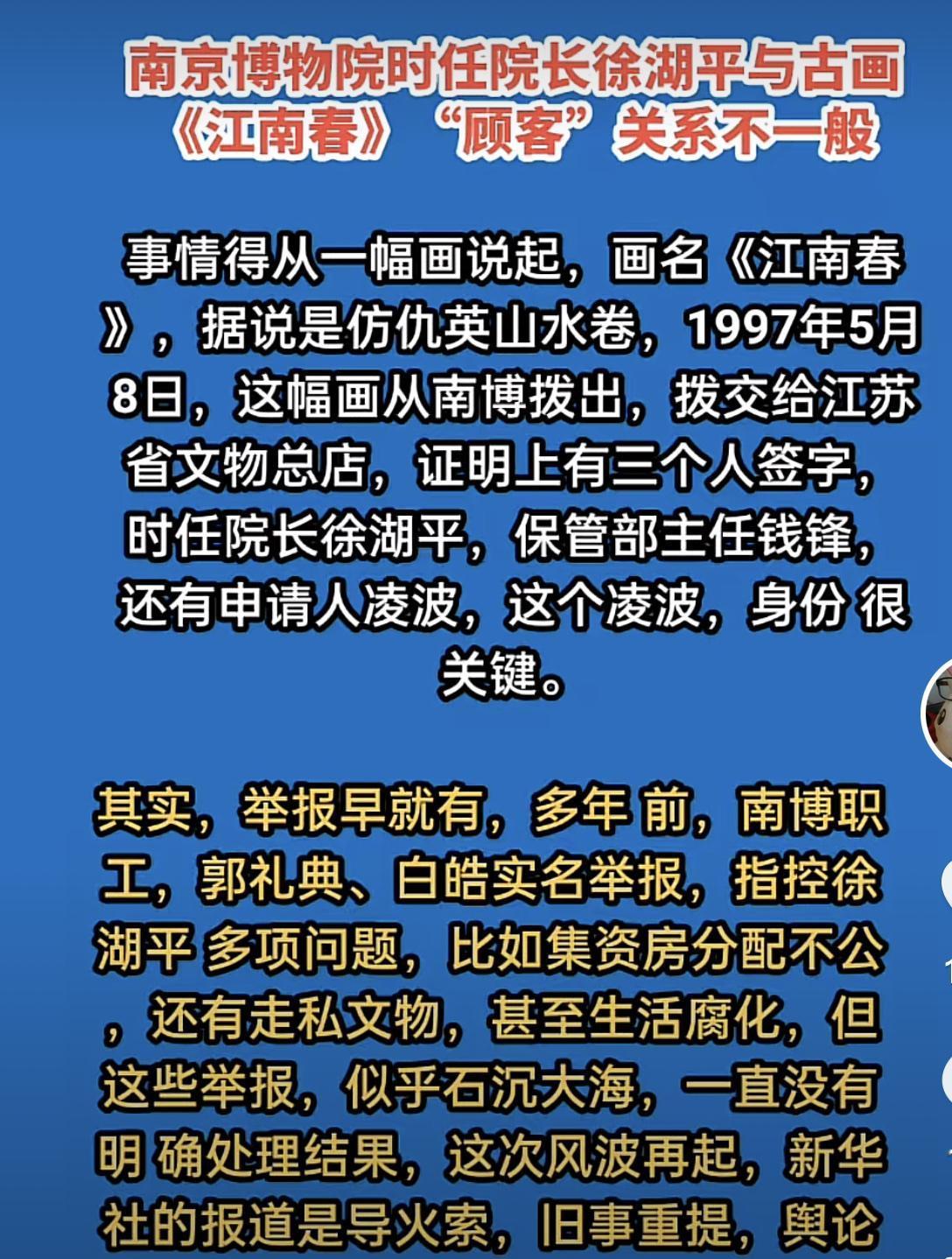 这波举报直接拉满! 南京博物院典藏部退休职工郭礼典,21日带着42人联名的举报原件,实名举报南京博物院原院长徐湖平。 举报说,当时时任院长徐湖平偷偷撬开故宫南迁2200件文物,当自家的东西一样,又送,又卖,还走私!没记错的话,南京博物馆有2800箱,听说到现在一直未开箱,难道真的被这些人监守自盗了? 徐湖平85岁了吧,毕竟辛苦一辈子,估计也不会乖乖说出来,郭礼典在10年前就开始举报,只是石沉大海,无声无息。现在只有看这次了,如果这次掀起的“水花”大一些,或许事件会有不一样的进展。