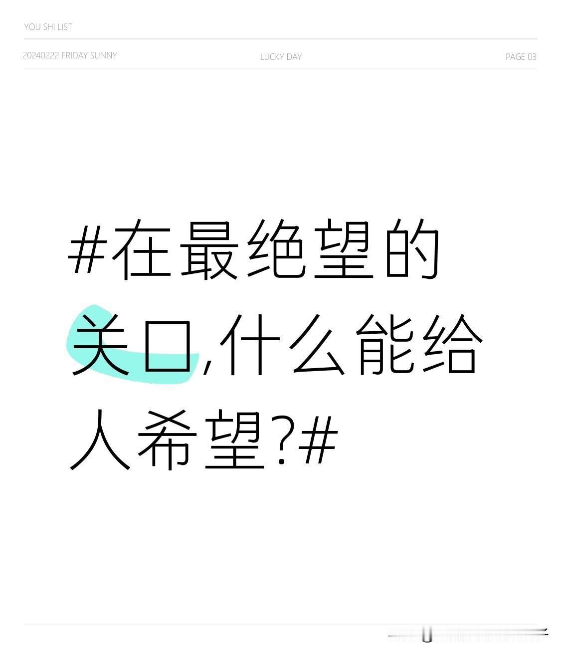 在最绝望的关口,什么能给人希望? 在最绝望的关口,不同的人能从不同事物中找到希望。有人靠心中坚持的微光。就像有个人,在漫长黑夜里迷失绝望,孤独与压抑铺天盖地,但心中那源自无数次失败挫折的坚持信念没熄灭,提醒他黑暗终会过去。他在事业挫折、生活重压下,用坚韧描绘生命画卷。 也有人是出于对家人的爱。农民老张查出癌症,医生说有希望治疗,可他却选择离开,因为他知道治疗会让家没希望,不治家还能撑着。他默默替全家扛下命运,这爱成了他绝望中的希望寄托。