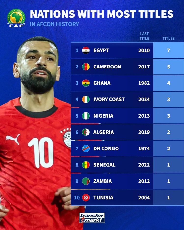 非洲杯夺冠次数榜:埃及7冠居首,喀麦隆5冠、加纳4冠二三位