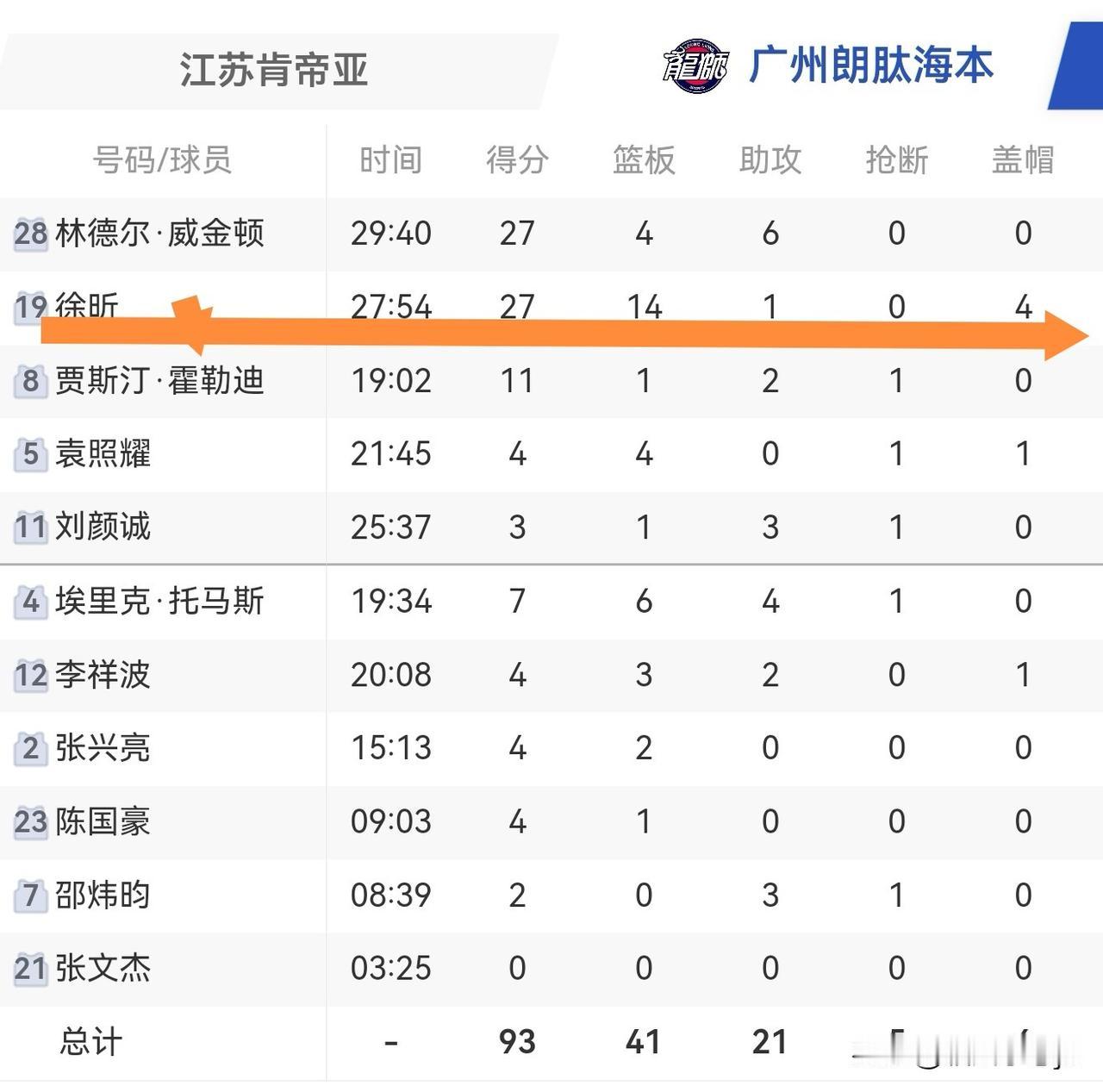 昨晚,广州朗肽海本队客场对阵江苏肯帝亚的比赛太精彩了,小将徐昕简直大放异彩,助力球队93 - 86获胜,还送对手4连败。 此役,徐昕出战27分54秒,投篮13投11中,罚球7罚5中,砍下27分14板1助4帽,数据创了新高。 首节,他连续送出2记盖帽,完成3次空接暴扣,单节拿下8分5板2帽;第三节,他和威金顿内外双核发力,带领球队打出30 - 18的分数实现反超;末节,他又连续内线得分,展现统治力。 此战,他在内线,那是横冲直撞,得分、篮板一把抓,直接助力球队拿下比赛胜利。 这场比赛,徐昕打出生涯最佳战,未来可期! (图片素材来自网络)